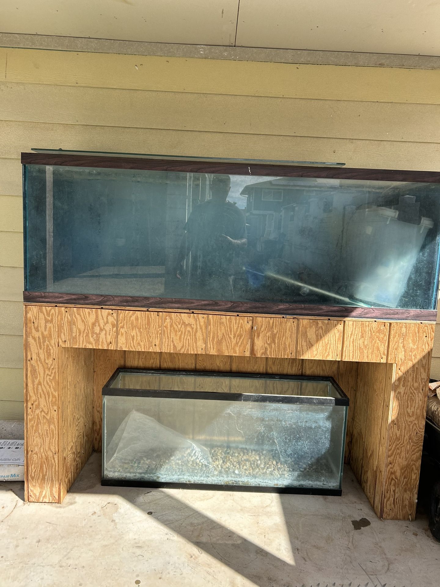 Up for sale 180 gallon fish tank 55 gallon fish tank Wooden tank stand 600 gph u.v. Filter All water treatment/ care products Pebbles for substrate 180 gallon tank is very heavy, bring help