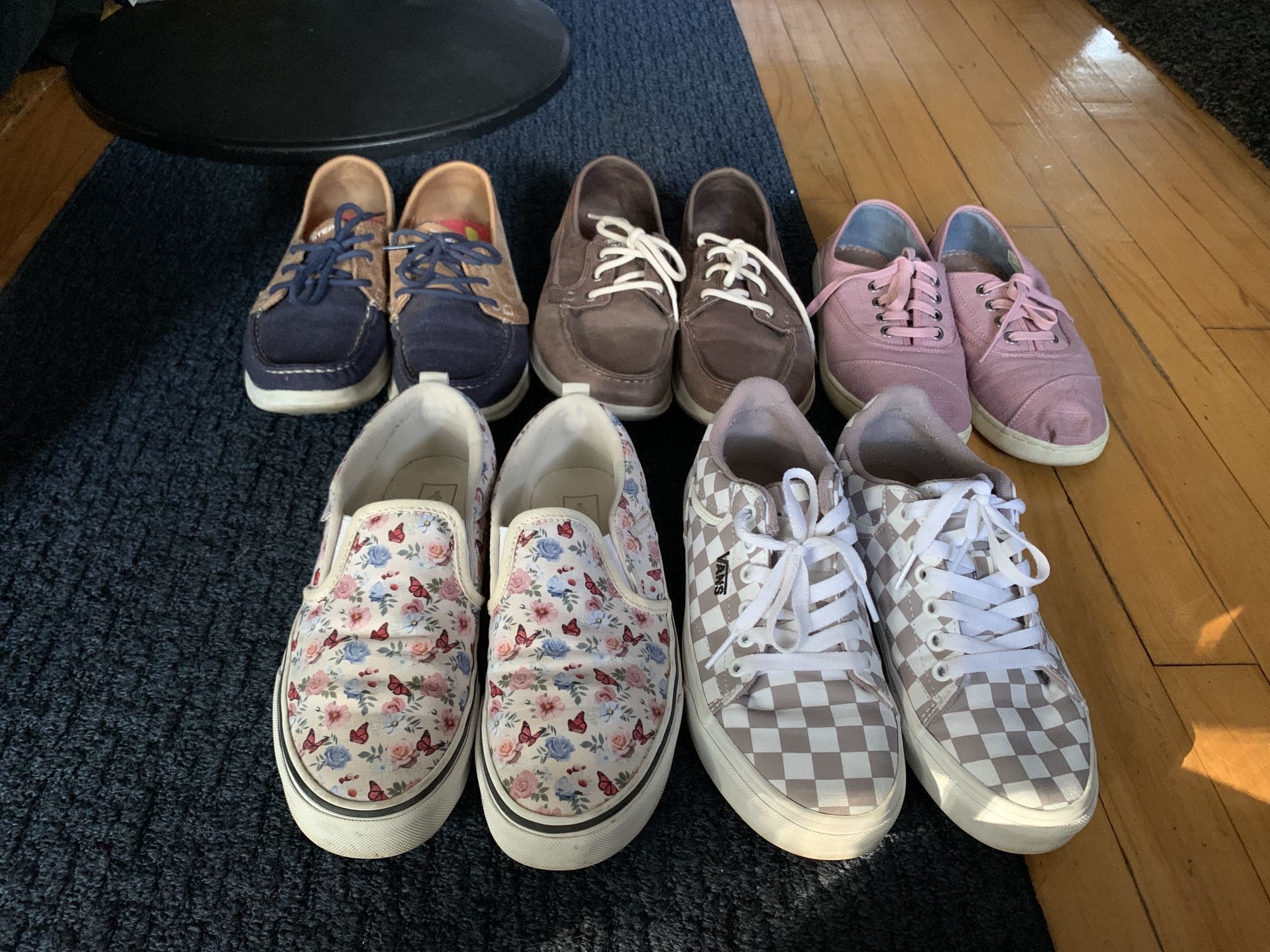 $5 each pair or take all for $20 Vans-Checkerboard Prpdovewht-size 6 Vans-Butterfly Floral White- size 6 Sketchers-Go Step Navy- size 6 Sketchers-On the Go Brown- size 6 Toms-Chambray Mauve- size 4