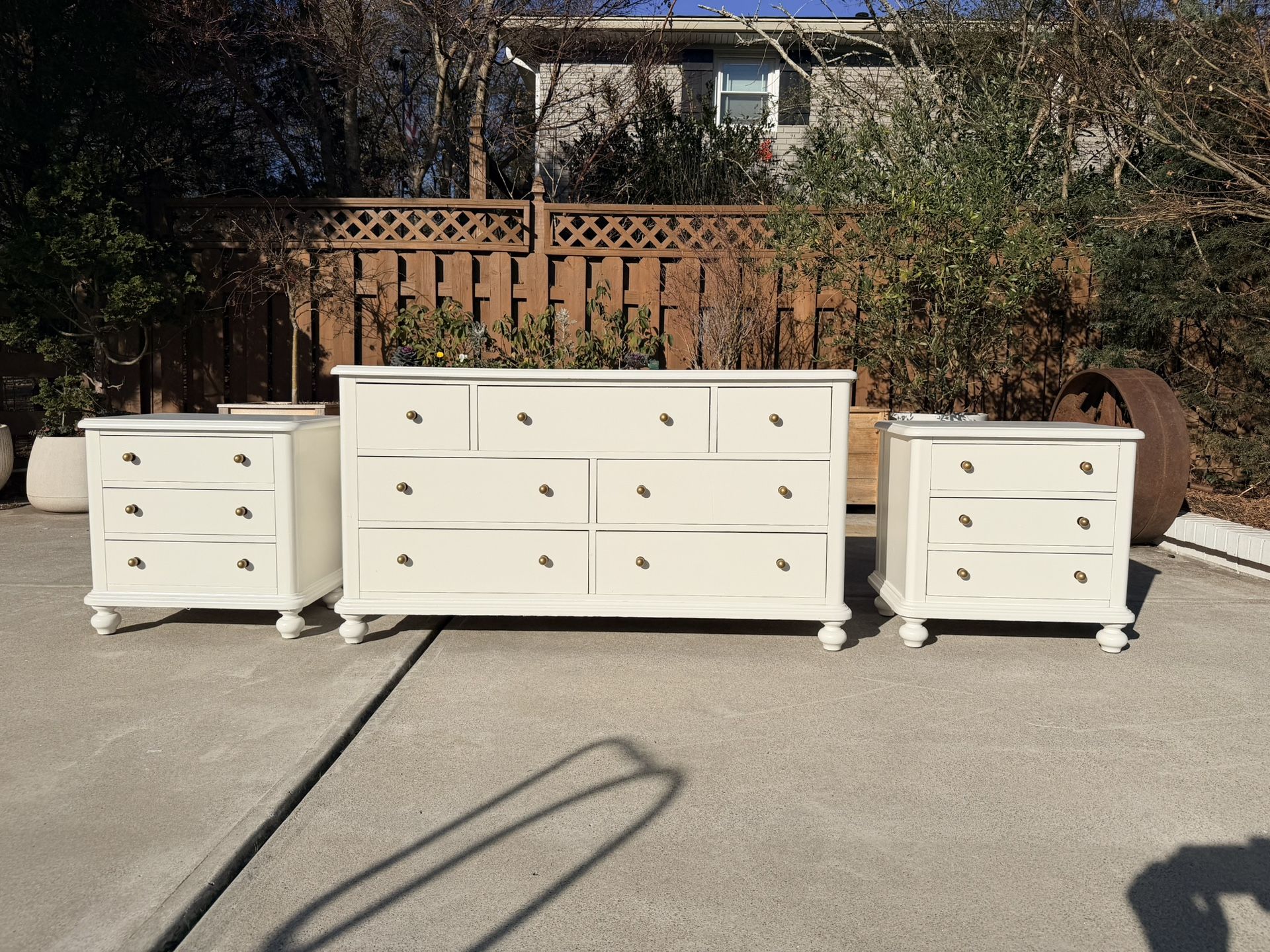 REFINISHED by Vignettes 100 % 🪵 dresser+ 2 nightstand $799 CAN DELIVER! Smoke, mold and pet free home! Dimensions are: Dresser 55”L*30”H*18.5”D Nightstand 24”L*19”H*16.5”D Professionally done with love and dedication and the most finest elements from Benjamin Moore called WHITE DOVE, scuffed sanded, primed, painted and sealed to protect the paint and furniture. Please see pics for dimensions and details, all drawers open and close properly, pick up near Sandy Plains and Canton Rd in Marietta 30066 or local delivery for a small fee depending on the distance. Cash, Zelle or Venmo accepted after delivery and inspection of the item. I have some other pieces if you are interested you can click on seller details to see my full inventory. Thanks for your interest!