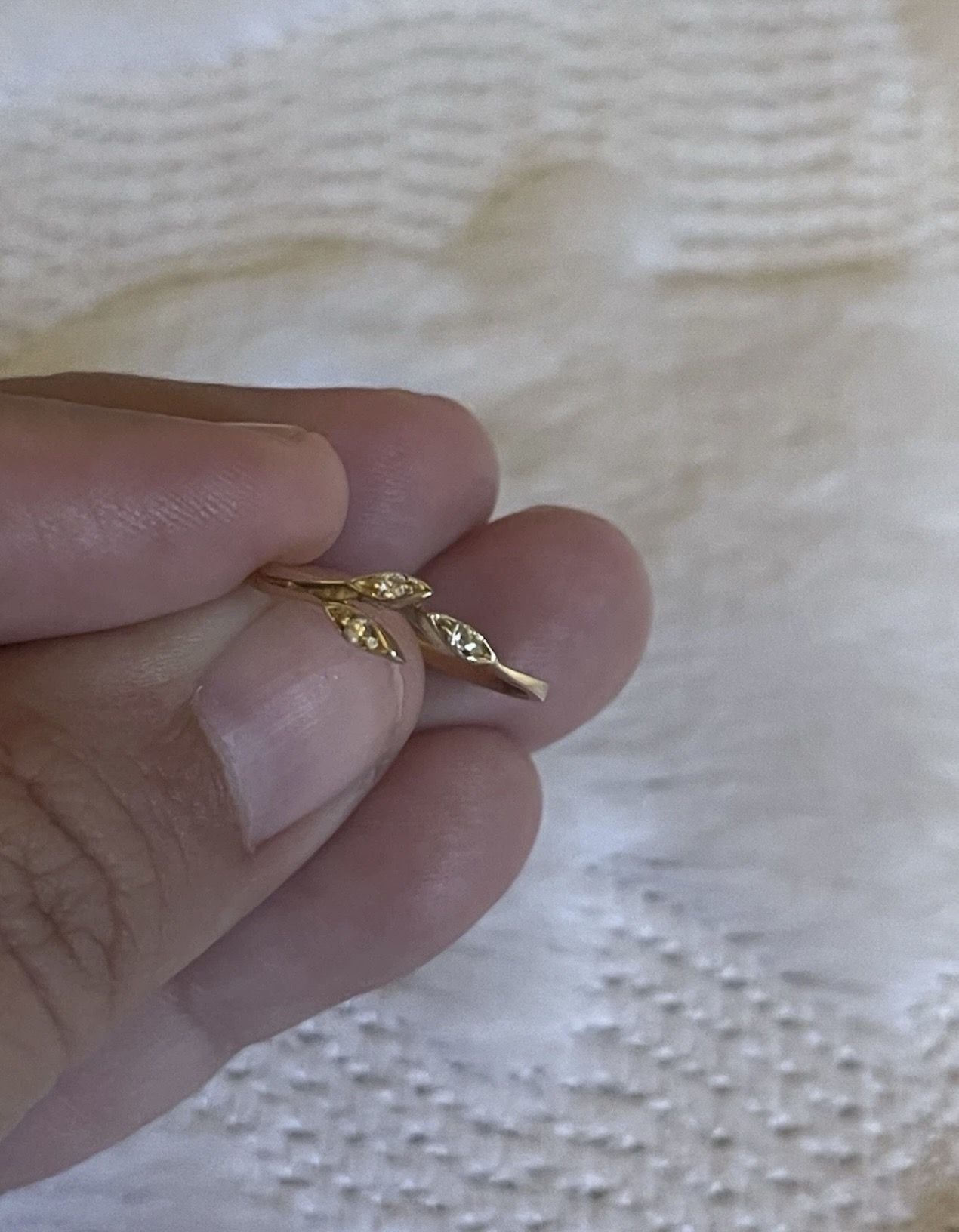 14k gold leaf design ring I’m selling my ring since I don’t use it and it doesn’t fit me I have no idea about the size Send offers and I’ll see if I like the price