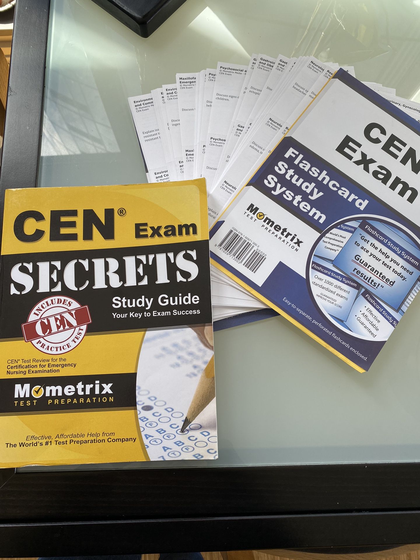 Certified Emergency Nurse exam study guide and flashcard study system. Both are basically new- the test inside is not written on and the flash cards are all still intact.