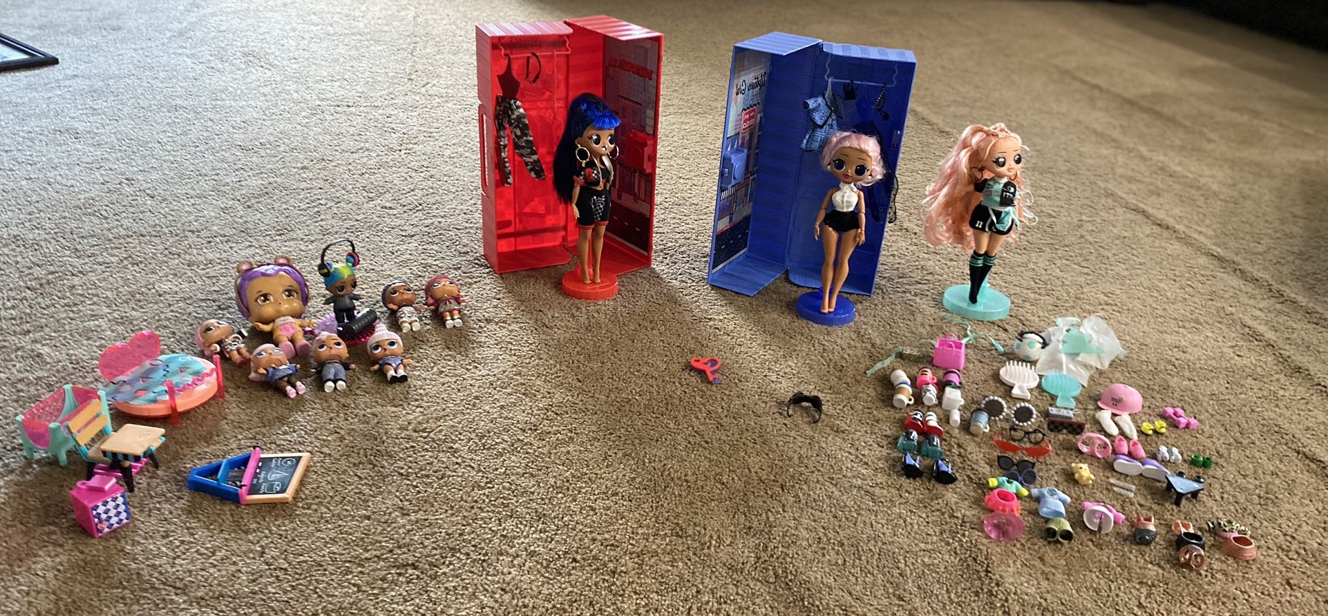 Three big lol dolls with her own closets and key and lock to get in and eight baby lol dolls with all clothes and accessories