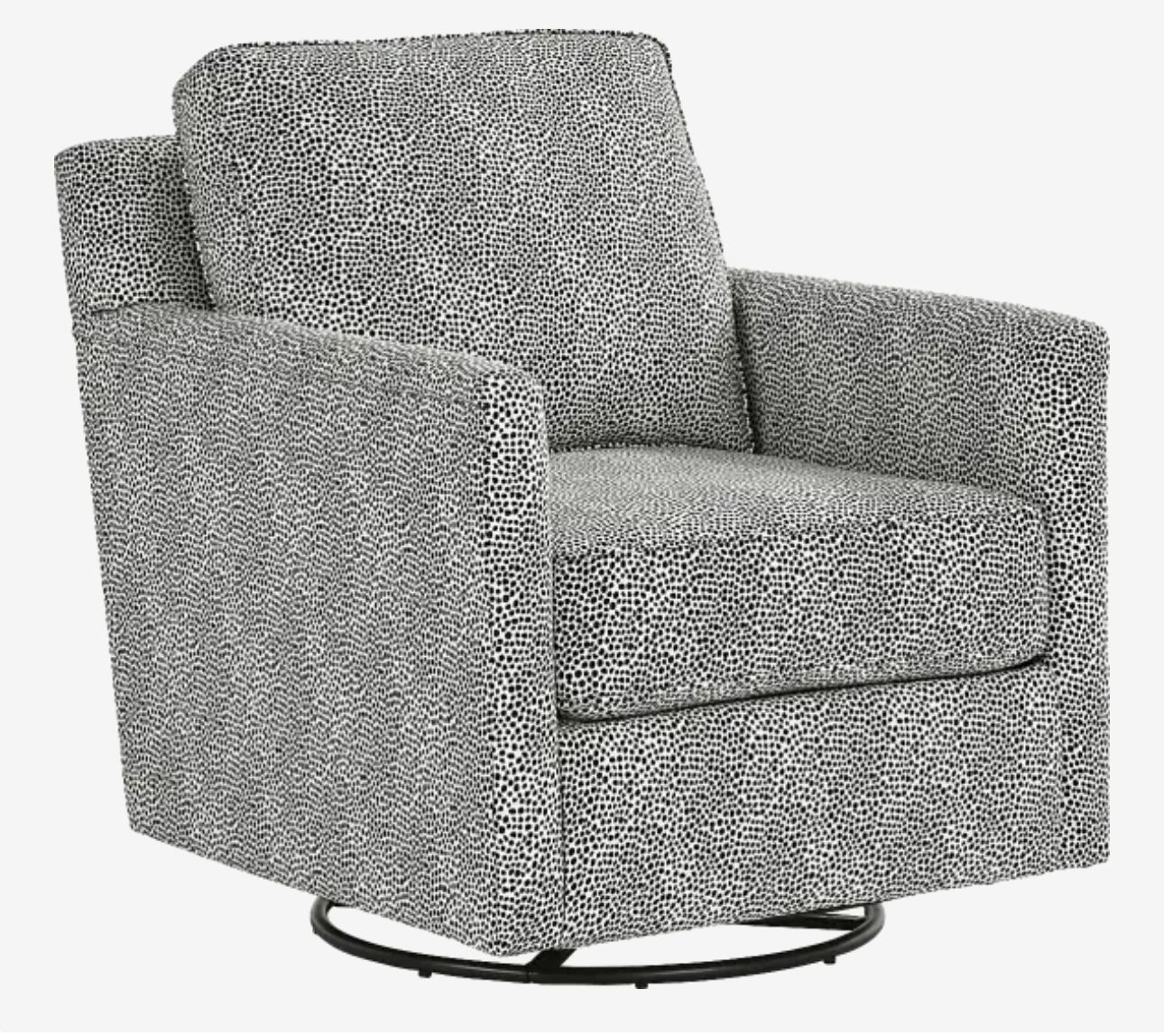 Blending modern and traditional styles, the Marisol Bay 360-degree swivel chair is an imaginative showcase of gorgeous spot patterning. The swivel's deep seat delivers cozy indulgence as the detachable back and seat cushions simplify cleaning. The all-around padded frame creates a charming silhouette from every angle for an ideal area to relax as it strikes that balance between elegance and functionality. 100% Cotton. Dimensions: 31.5"W x 37.5"D x 40"H Too big for office area setup. $187.50 per chair