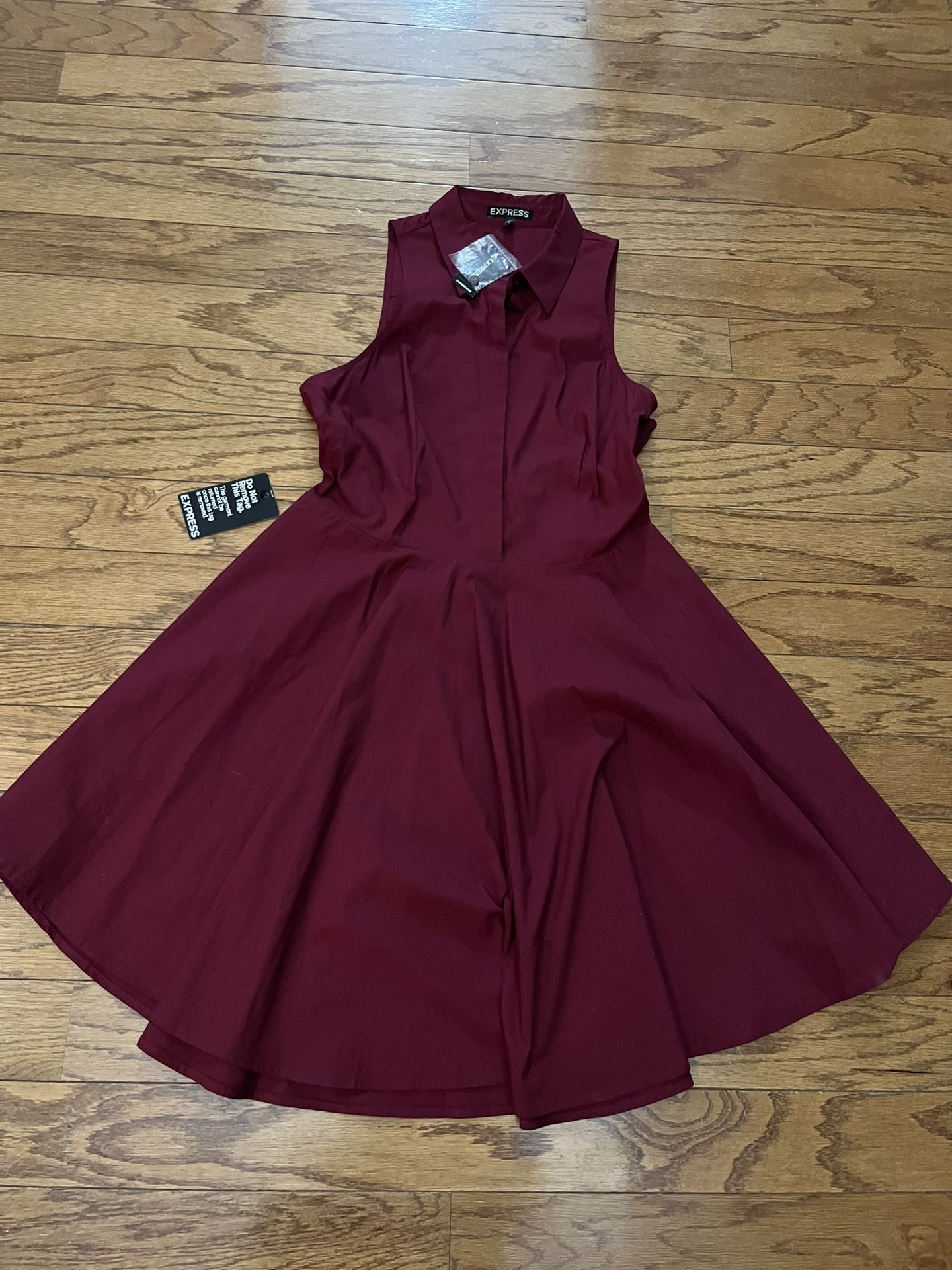 NWT Express Dress - NWT, Express brand. Deep Maroon color. Size 8, has functional pockets, front neckline is deep cut and has functional hidden button closure, side zipper closure, skirt hemline is rounded not straight.