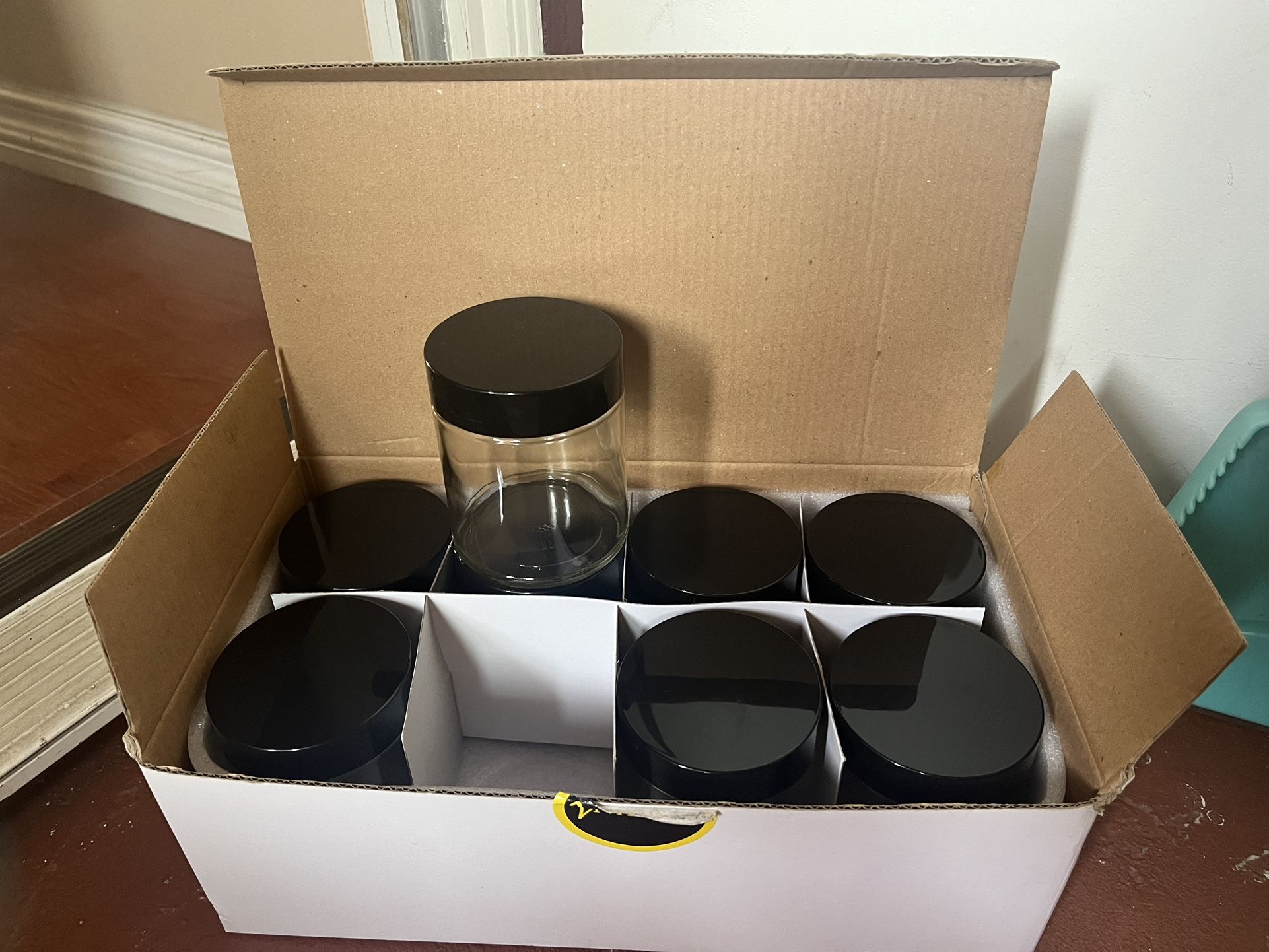Glass jars with black lids. 8.