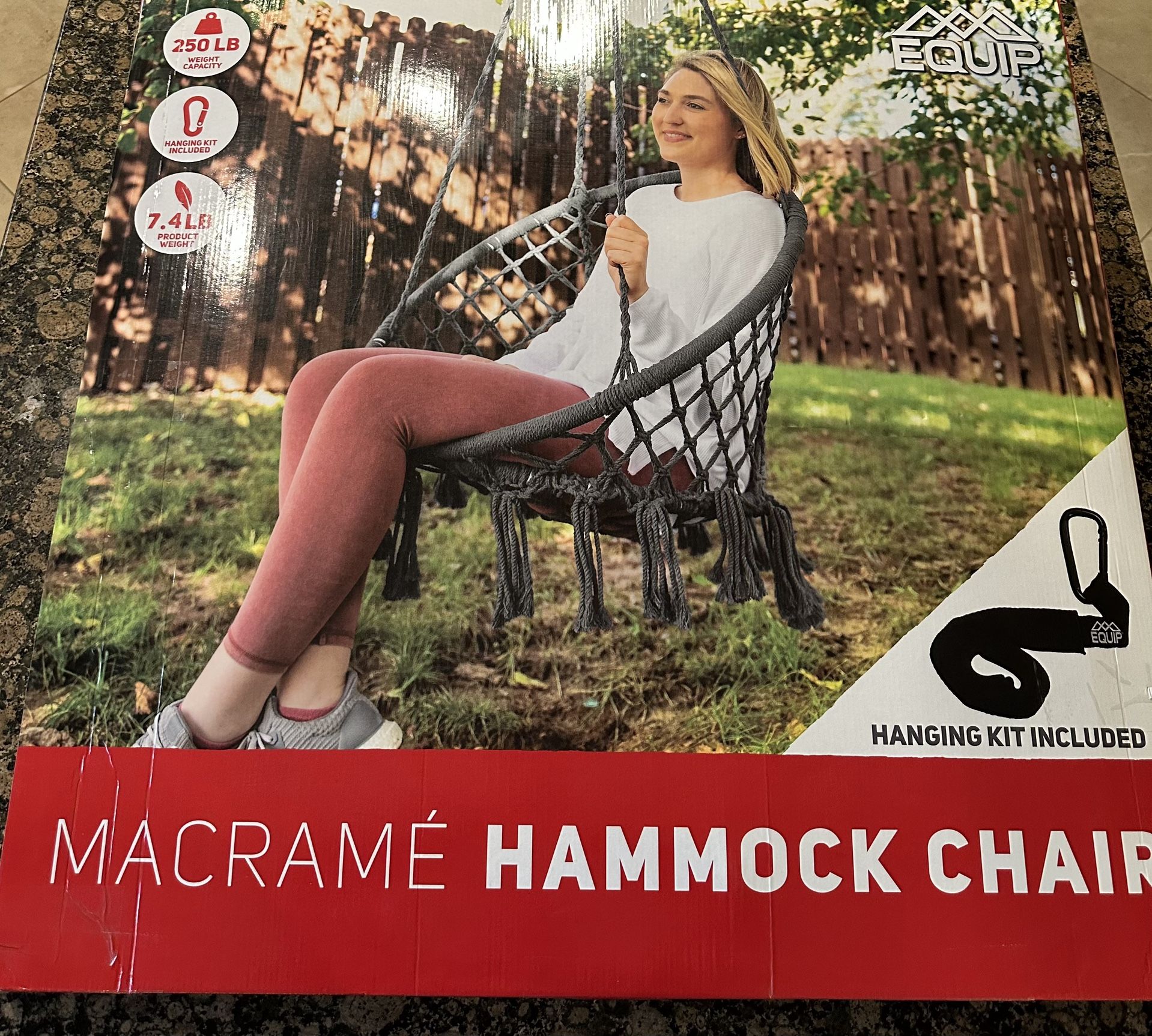 Equip Macrame Hammock Chair Swing, This product is designed for relaxation and is suitable for both indoor and outdoor use. Weight Capacity: 250 lbs. Materials: A blend of cotton, polyester, rayon, and other fibers. Included Hardware: Comes with a complete hanging kit, including a tree strap and carabiner. Weight: The product weighs 7.4 lbs (or 8.4 lbs depending on the specific model). Dimensions: Open size is approximately 31.5" L x 24" W. Brand New in the box.