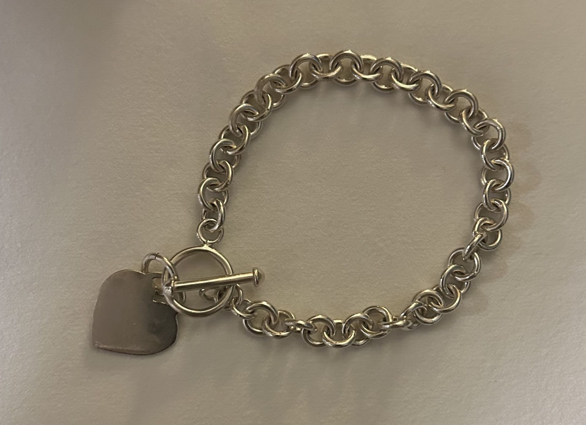 This elegant silver bracelet features a charming heart pendant, perfect for adding a touch of sophistication to any outfit. I used to wear this bracelet often so the heart does have some signs of wear (see photos). Weight 24 grams