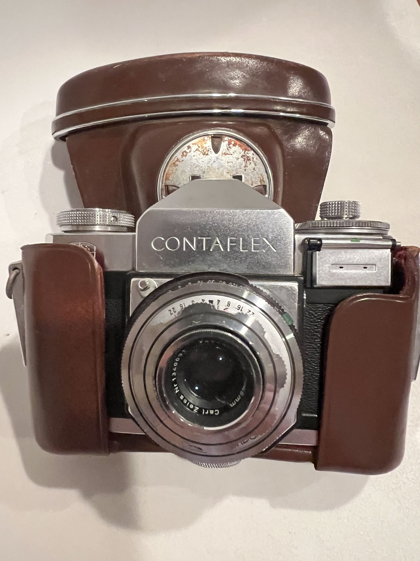 Zeiss ikon CONTAFLEX with Tessar lens The camera is in great condition but the leather case is partially torn.