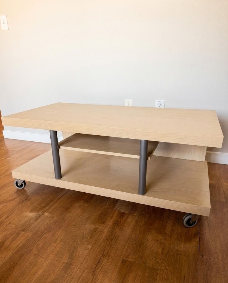 Versatile IKEA table in a light birch finish, perfect for use as a coffee table or a low TV stand. It features a handy bottom shelf for extra storage and smooth-rolling wheels that make it easy to move for cleaning or rearranging your space. Sturdy and in great condition! Dimensions - Length: 46" - Width: 23" - Height: 19.5"