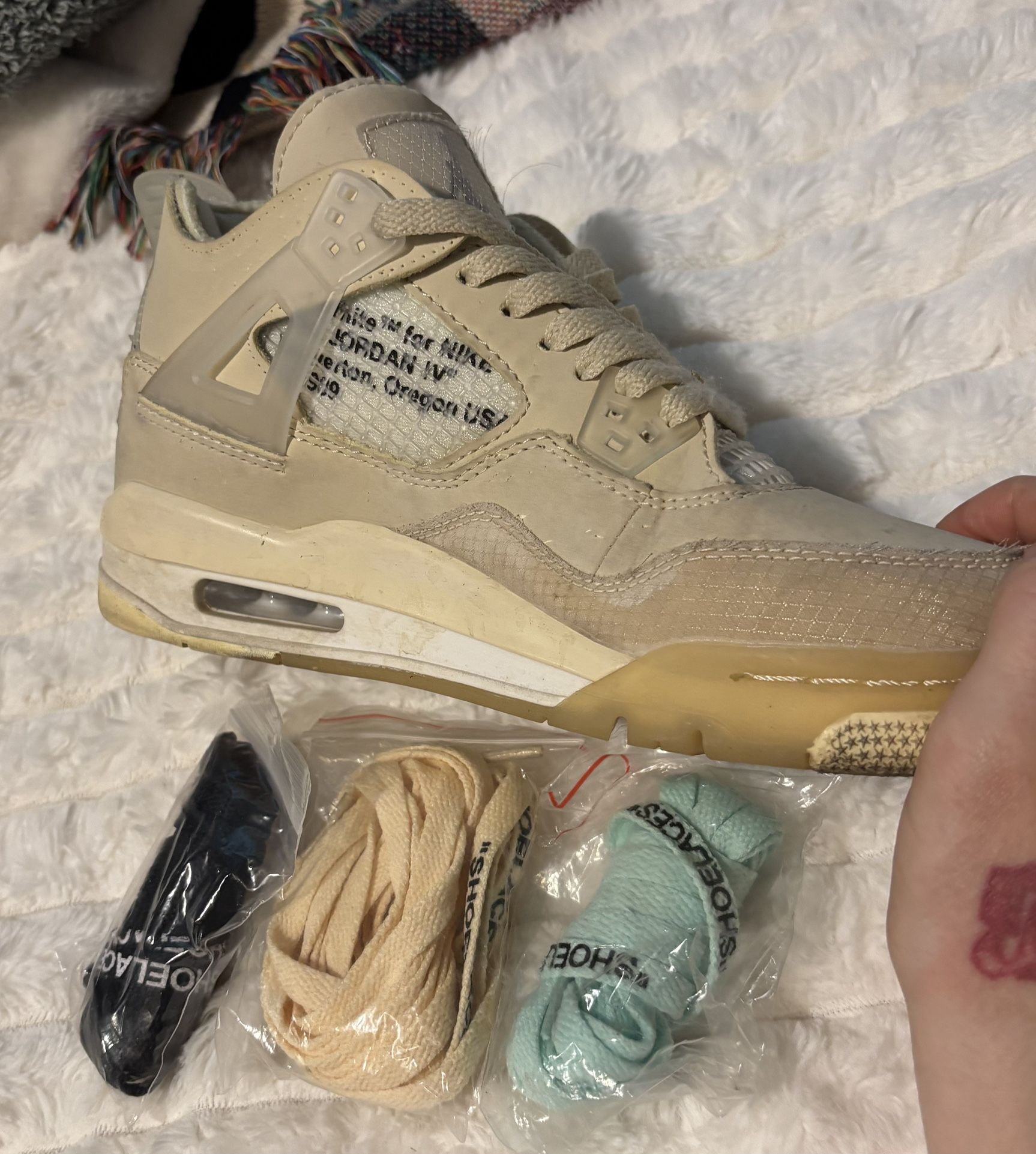Jordan 4 Retro Off White Sail Size US 5 Got off StockX like 5 years ago Worn, kinda beat but can save with a good cleaning Comes with original extra laces (3 pairs)