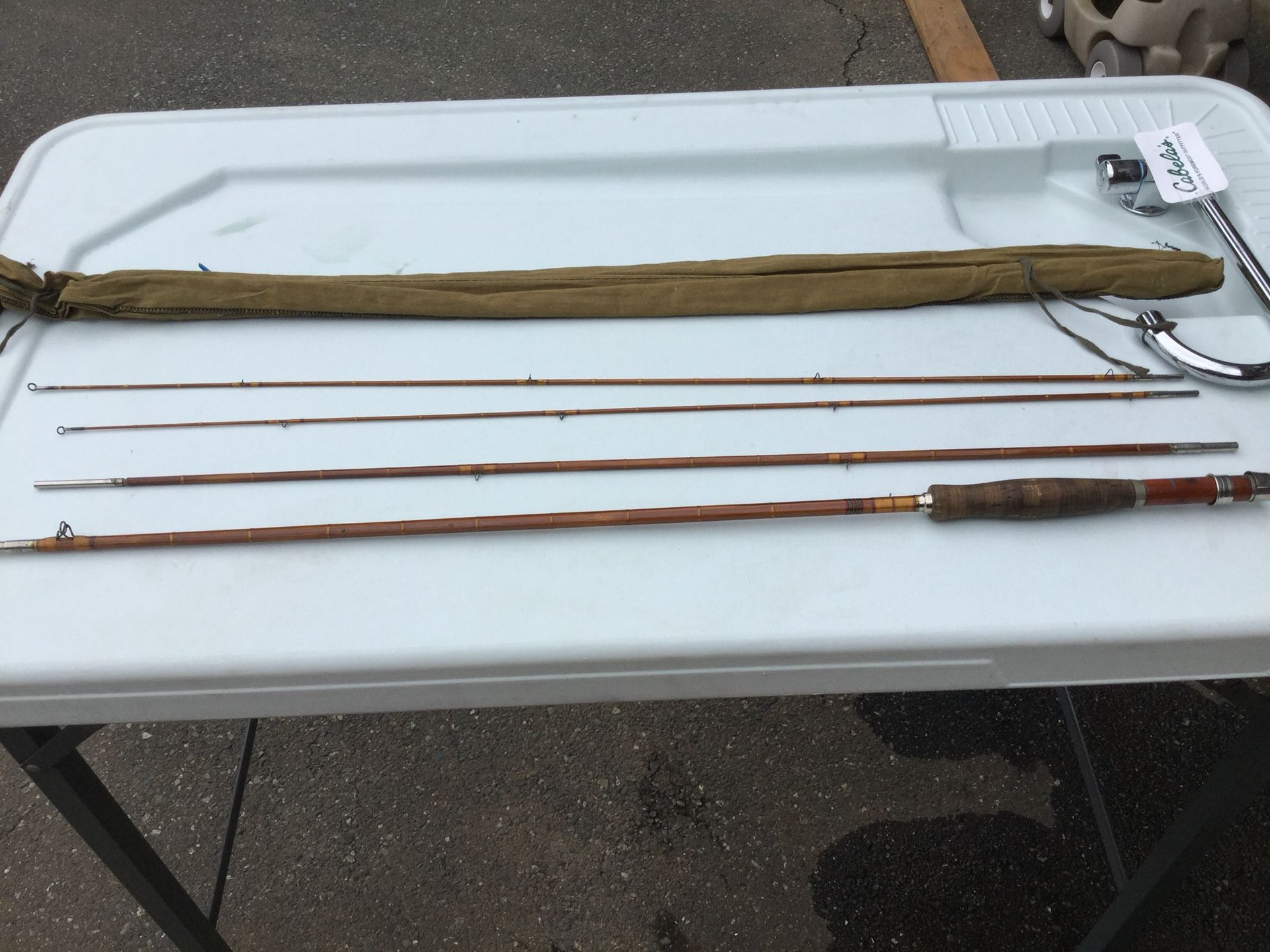 Antique Bamboo fly rod. Hand made by unknown artisan. This is a one of a kind American made beauty. Good condition with great wraps. Three piece with extra tip. Also comes with cloth case.