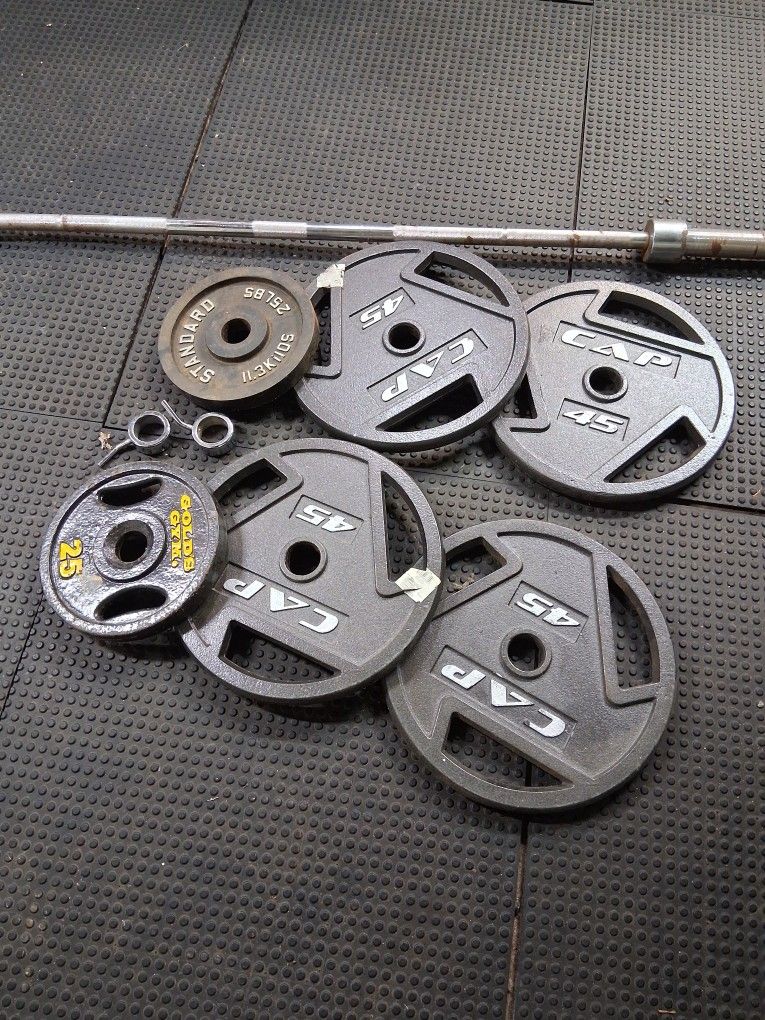 45x4, 25x2 45-pound Olympic bar with clamps 275 pounds total Olympic Weights gym exercise workout fitness dumbells bench bar weight cardio boxing