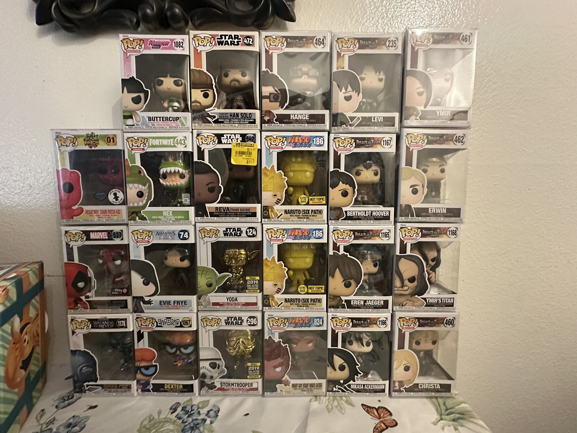 I have a mix of Star Wars, Attack on Titan, Naruto, Marvel, Assassins Creed, Dexter, Powerpuff girls, Fortnite, and Sour Patch Kids Funko Pops I need to get rid of. I don’t have a set price, as of right now I’m looking for offers on either the whole lot or whatever you’re interested in. If you are interested in a lot then I don’t mind making a good deal ! Feel free to bundle up with some of my other listings !