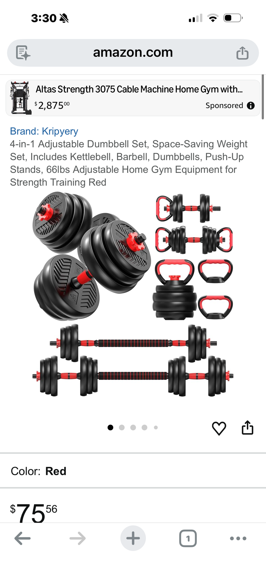 Versatile Kripryery 4-in-1 adjustable weight set. Has 66lbs total weight. Use as dumbbells, barbell, kettlebell, or push-up stands. Space-saving design. Red color. Selling as is. Open box but new. You can look at it before you buy. Box is beat up but al weights and pieces accounted for and in excellent shape. Bubble wrapped.