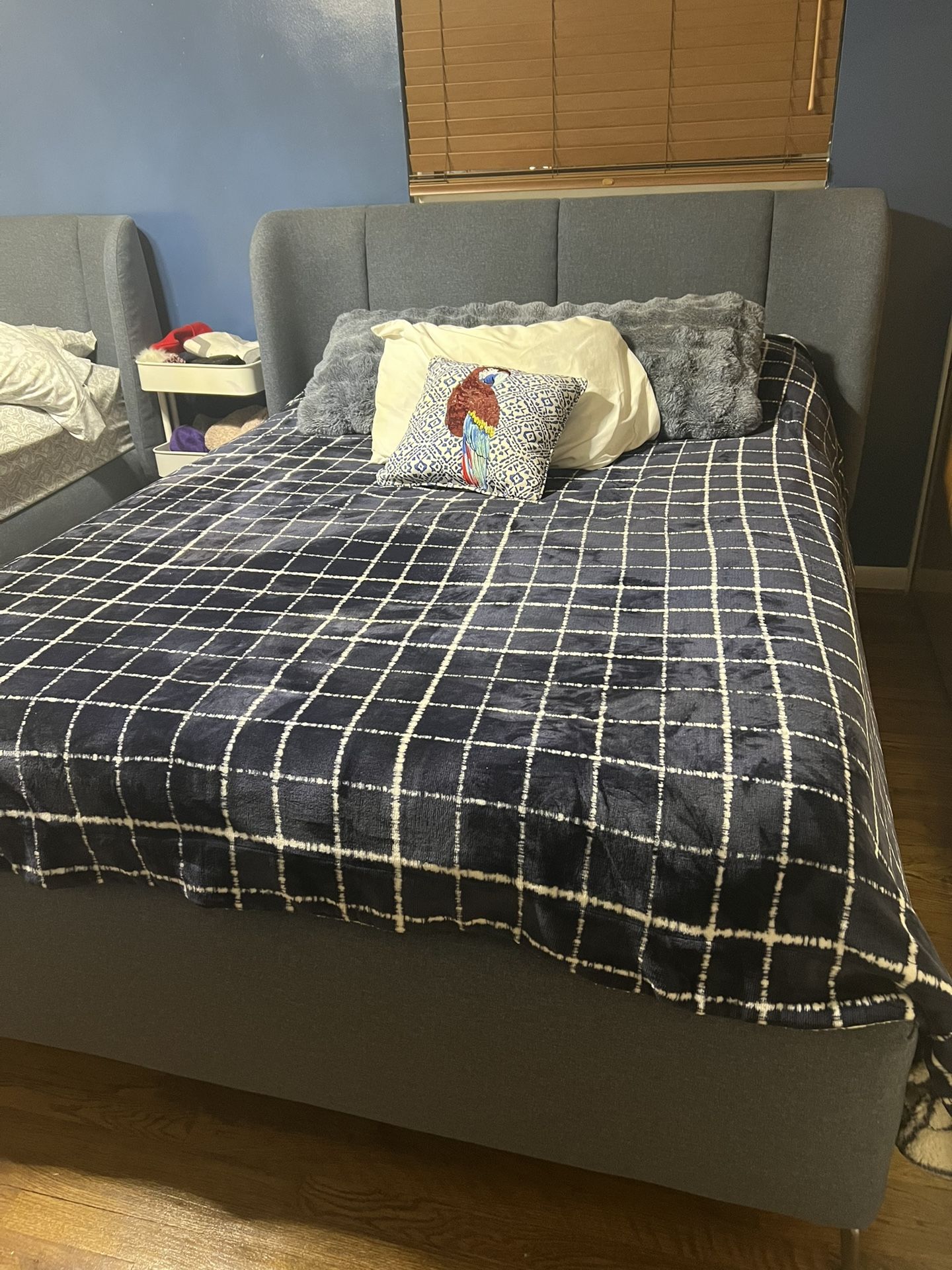 Brand new queen-size bed frame with 4 built-in storage drawers (2 on each side). Upholstered in a unique denim/jeans-style fabric, including the headboard. Very modern, sturdy, and stylish. No stains, no damage — like new condition. Selling for $500. Pickup only.