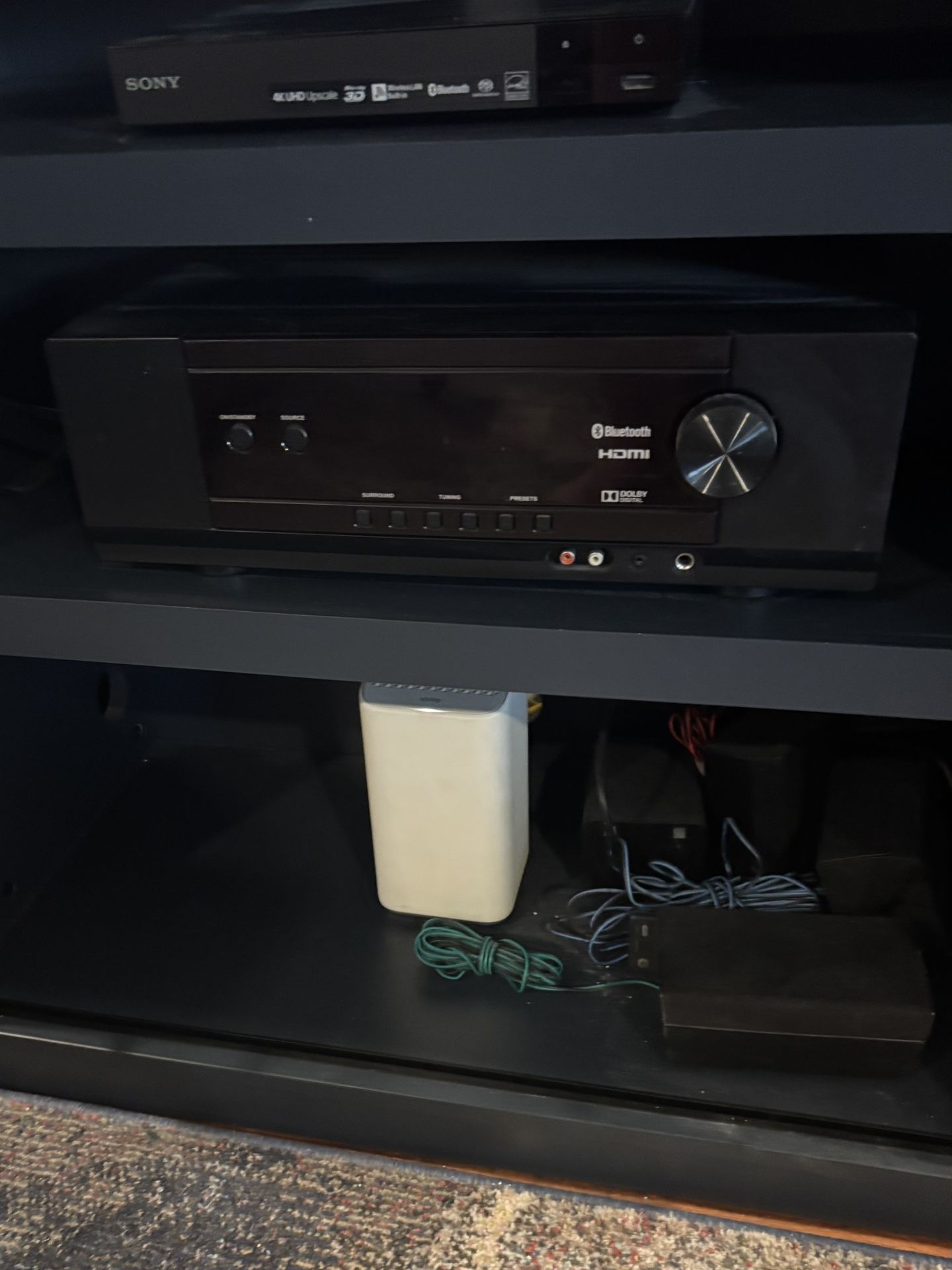 Surround sound system, comes with four speakers that have wires. Plus a base box hardly used it has Bluetooth remote.