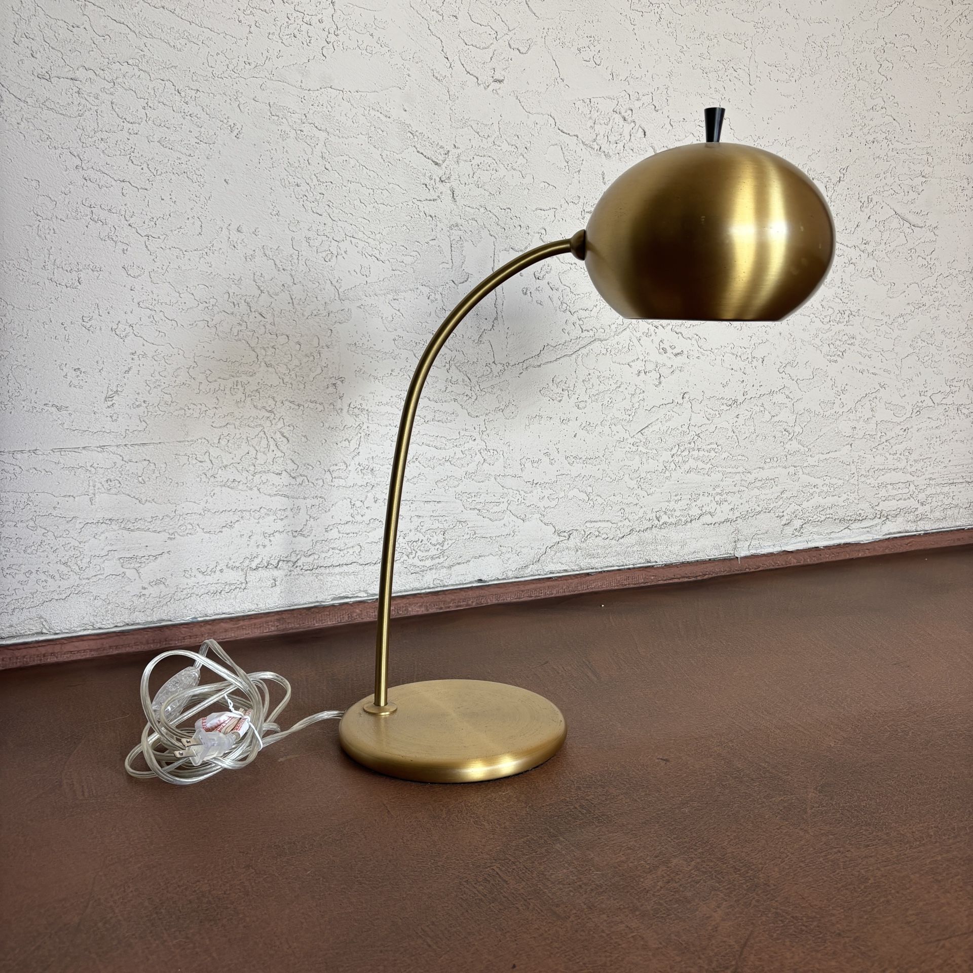 A tabletop version of one of our best-selling lamps, this metal lamp was inspired by an iconic '60s design. Its swivel head directs light right where you need it, making it ideal for work stations and reading nooks. 8"w x 16"d x 20"h. Base x neck x overall height Metal in an Antique Brass finish. Shade rotates side-to-side. Clear very long 8’2” PVC cord. Plug-in. Imported. One West Elm Antique Brass Table Lamp
