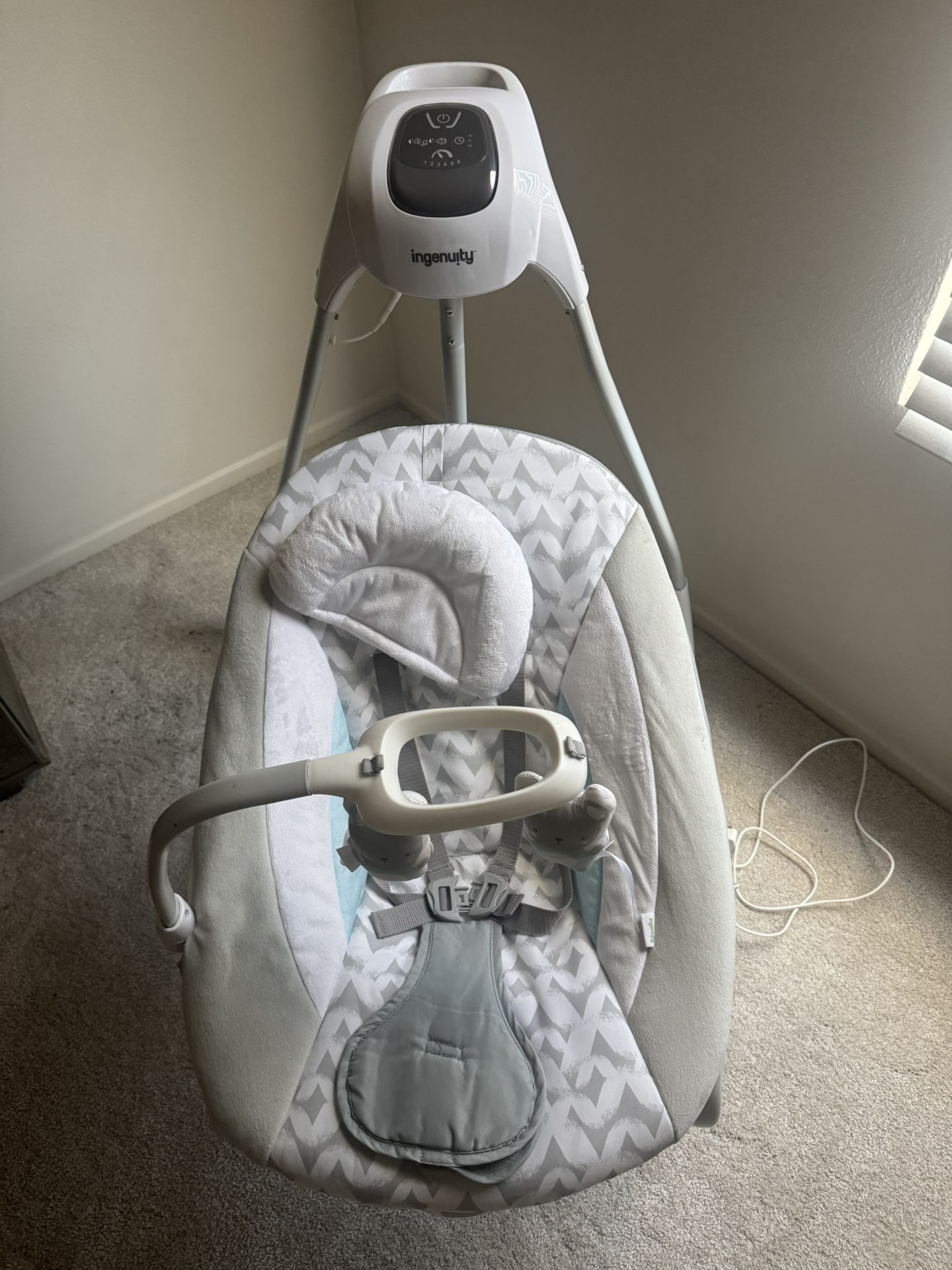 Like new baby swing. In great condition. Taupe/greyish and white . Pick up only in Eastvale. Near Rosa Parks Elementary (so you can map distance).