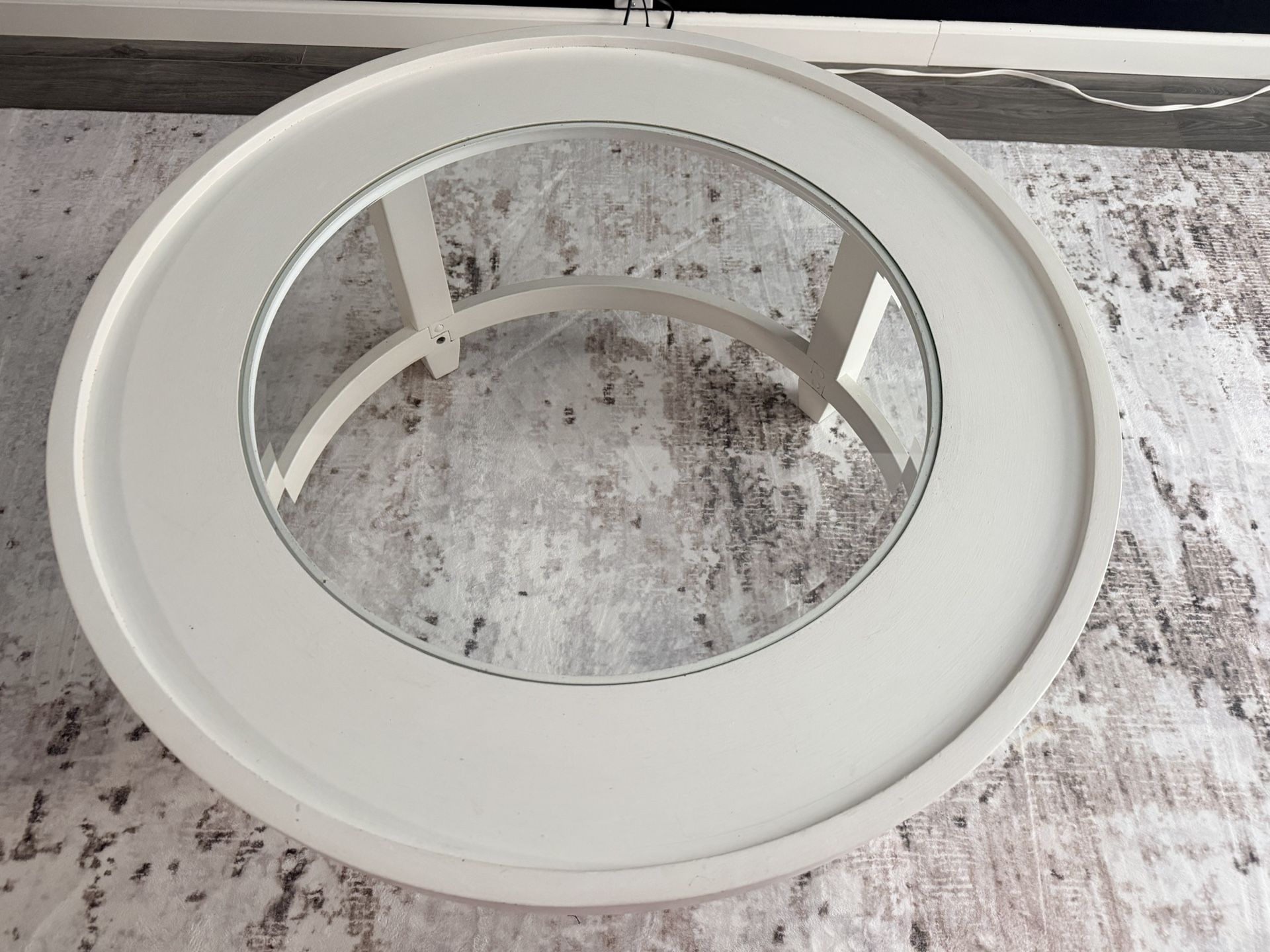 White Round coffee table It’s wood and painted white and has small wear/tear scuffs/scratches. Glass has one larger scratch, see image for reference. Material: Wood Color: White Width: 33 inches Height: 19 inches Location: Grand and Harlem
