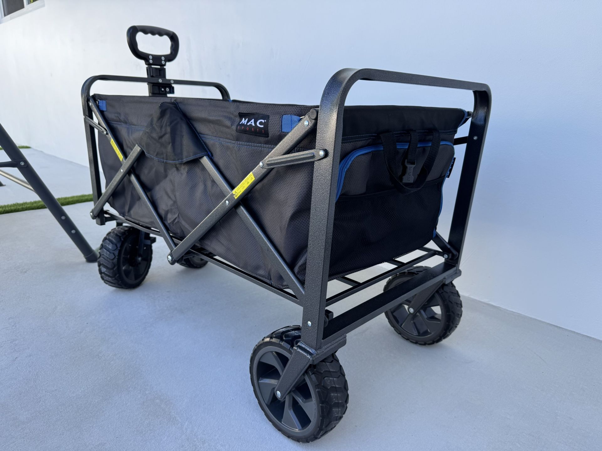 Mac Sports XL Folding Wagon with Brakes The Mac Sports XL Folding Wagon is great for sporting events, outdoor adventures, grocery shopping and much more! The large all-terrain wheels allow for a seamless transition across multiple surfaces but with the incorporated braking mechanisms your cargo stays wherever you want it to. The easy-open back panel makes transporting even longer items like canopies or umbrellas a breeze. No assembly required and collapses conveniently for easy storage.