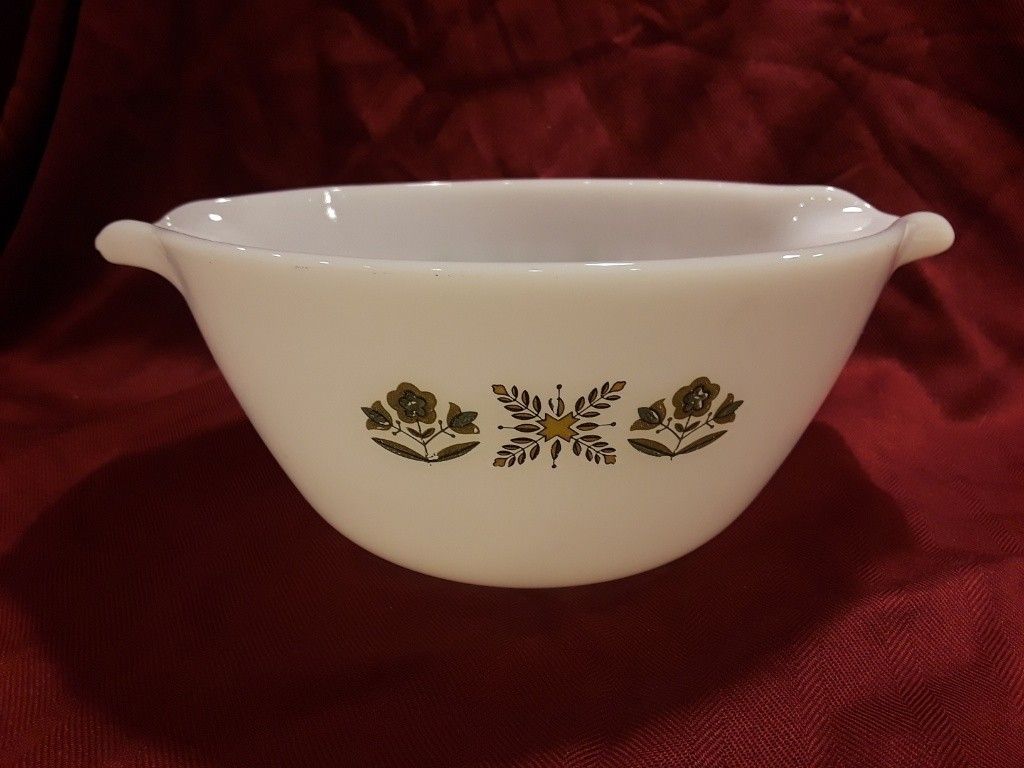 Like new condition Anchor Hocking vintage mixing bowl. Size 10" x 9" x 4.5". Fire king model in Green Meadow pattern. Absolutely no chips or cracks. Just beautiful double pour spout baking mixing bowl in milk glass color.