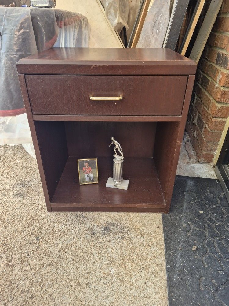 This is a mahogany colored nightstand with a drawer and storage space for multiple items. In great condition. Size: 16" deep x 21 wide x 25 tall.