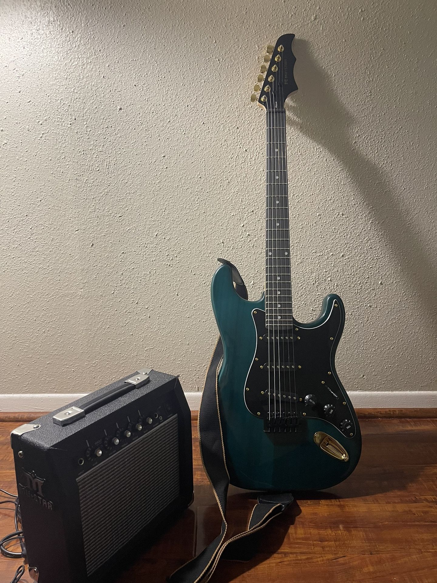 This is a brand-new gold and green guitar, absolutely free of any scratches. It's a complete set, including the amplifier and some useful extras like picks and a fresh set of strings.