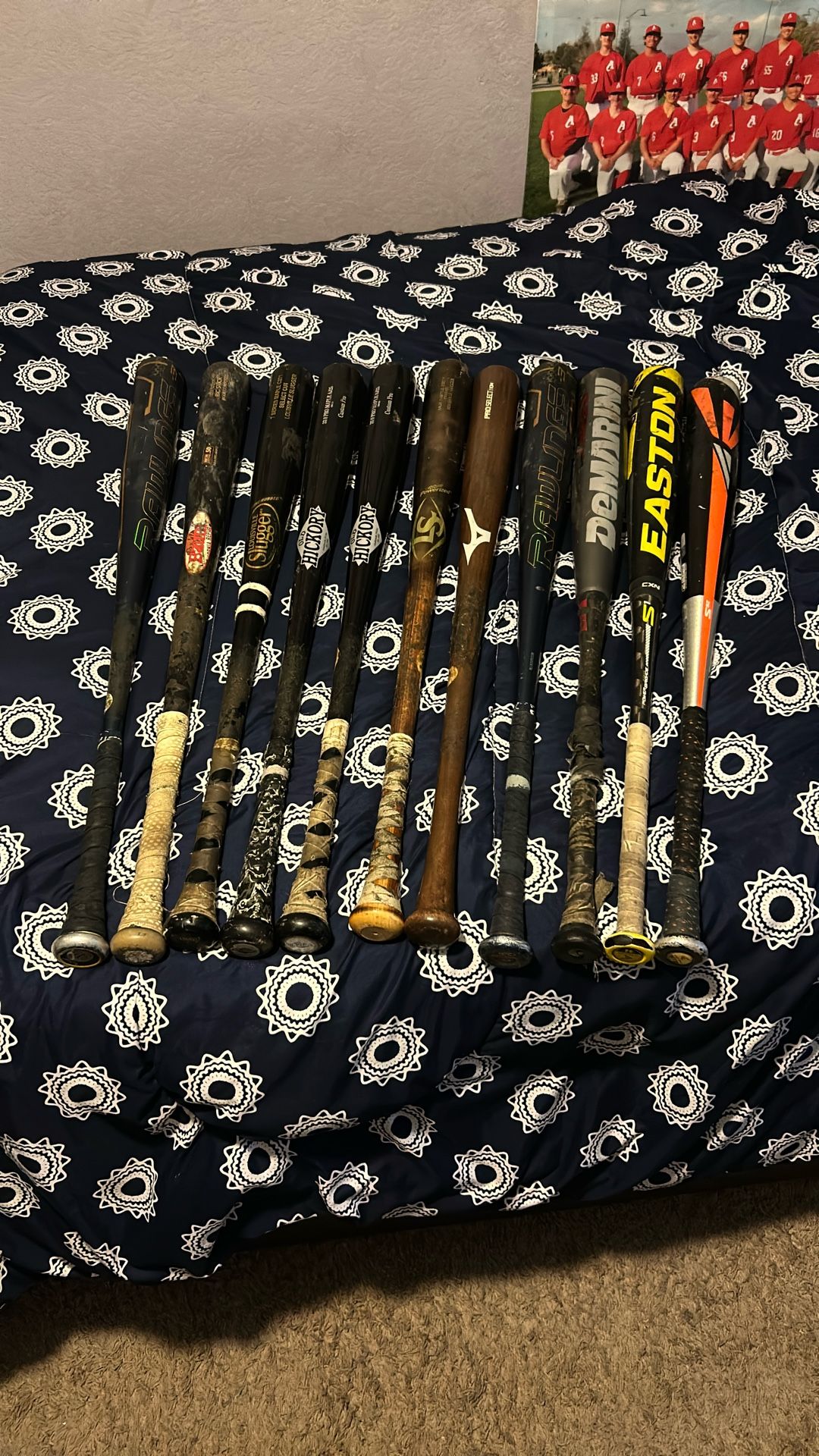 All bbcor/ drop 3 Left bat=34 inches Baum bat (2nd to left)=33.5 inches All middle bats= 33inches Easton (right bat)= 32 inches Take them all, shoot me offer on any. Will do discount for bundles