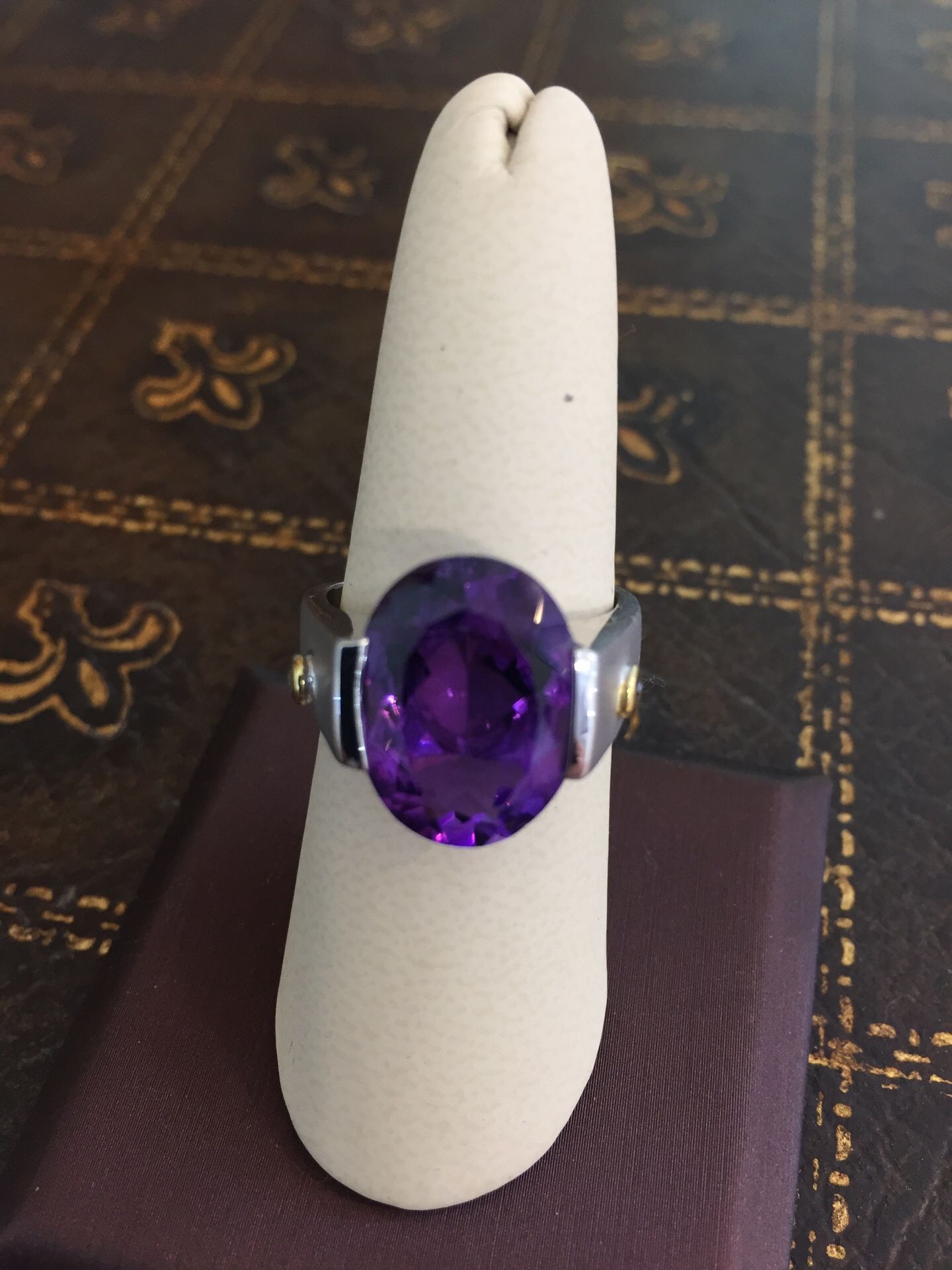Natural Amethyst 9.55 ct Diamonds 14 K and 925 silver handmade unique ring in size 7. Sizing can be done upon request . One of a kind ring.