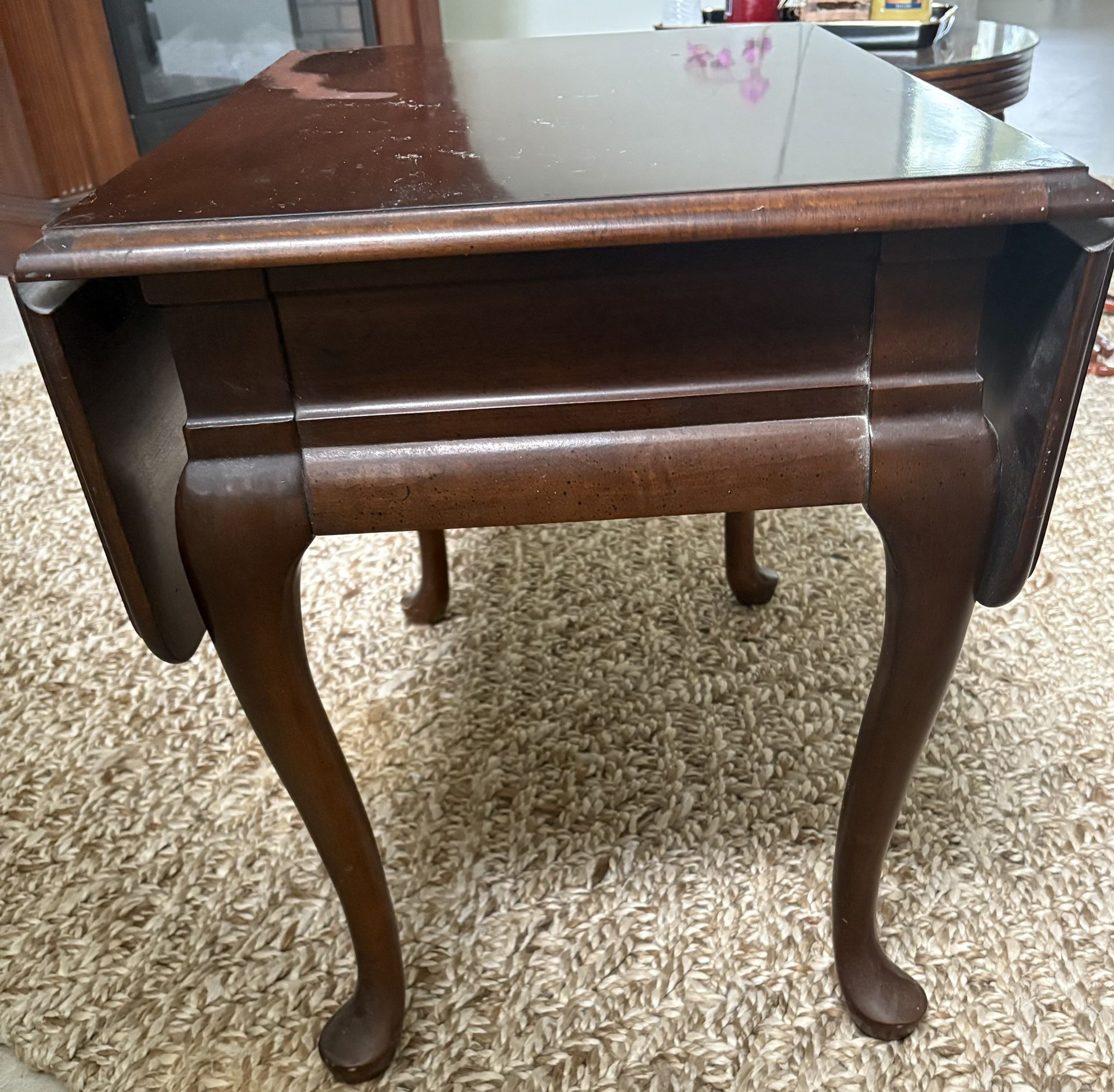 Vintage Queen Anne end table with side leafs. Solid cherry wood. Wood top finish is damaged but can be refinished to look good as new. Offered at $35