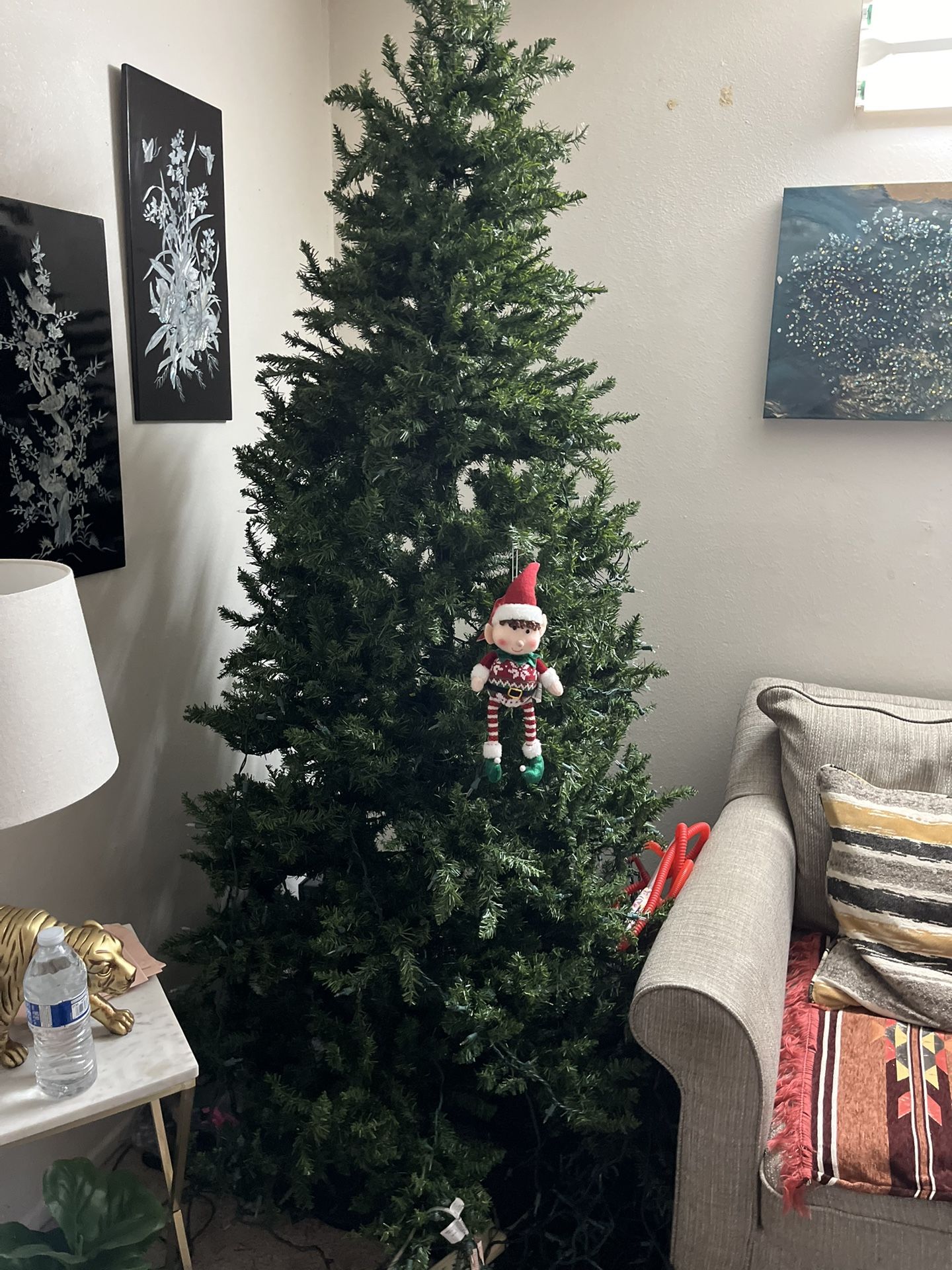 A very large Christmas tree that reaches the ceiling, along with some ornaments. Used for only one year.