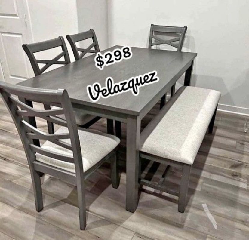 • ✅ $298 + sales tax = ($330 total) • Cash only – firm price • ‼️ Pick-up only (Delivery is not available) • All brand new Includes: • Dining table • 4 padded side chairs • Padded bench Details: • Table: 60” x 36” x 30” H • Side Chairs: 19” x 22” x 38” H • Bench: 16” x 50” x 19” H • Gray finish wood • Upholstered padded seats for comfort • Durable, everyday dining set • Assembly required
