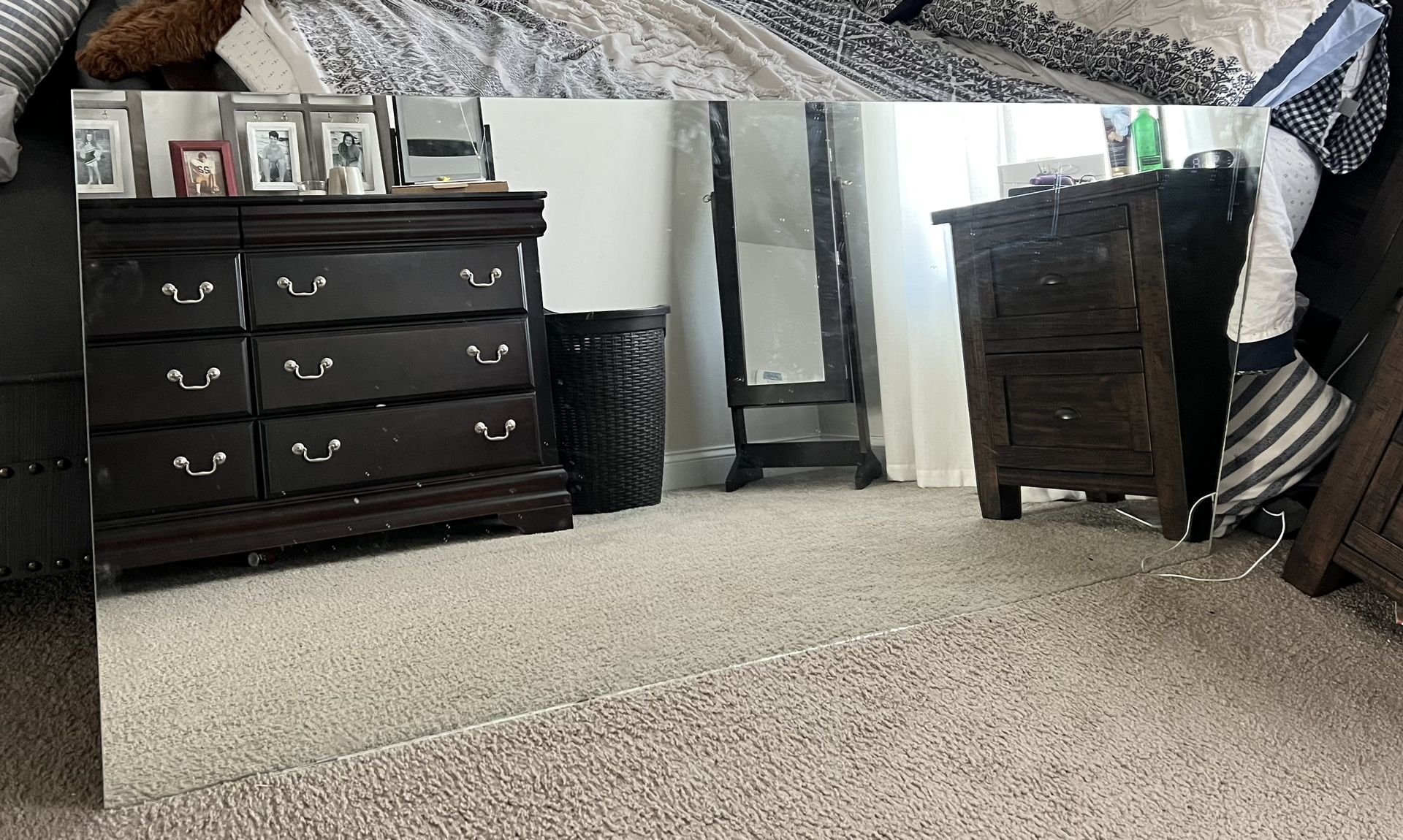 Large mirror with hardware for hanging. Size is 77.5 inches x 33 inches. Silver base, screws for mounting included along with brackets and screws for top edge. Excellent condition.