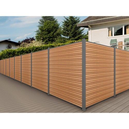 Ultra Easy Fencino 6 ft. H x 6 ft. W Peruvian Teak Wood Plastic Can be used for many projects like the gate in the photo Composite Horizontal Fence Section with Gray Frame by NewTechWood Current new prices over $300 per box, this is a steal!
