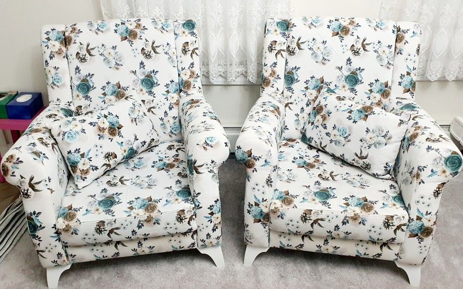 Armchair. Comes from pet and smoke free home. (Also shoe free home). Clean condition. About 3-4 years old. No tear on the seating or arm areas. No broken areas. Legs are in new condition. Always were on the carpet. Zipper area on the back and under so you can access and remove both sides if needed. Price for both $250 Overall dimension Witdh 34" Depth 33" Height 38" Seating Area Width 21" Depth 25" Height 16" (included 5" white legs)