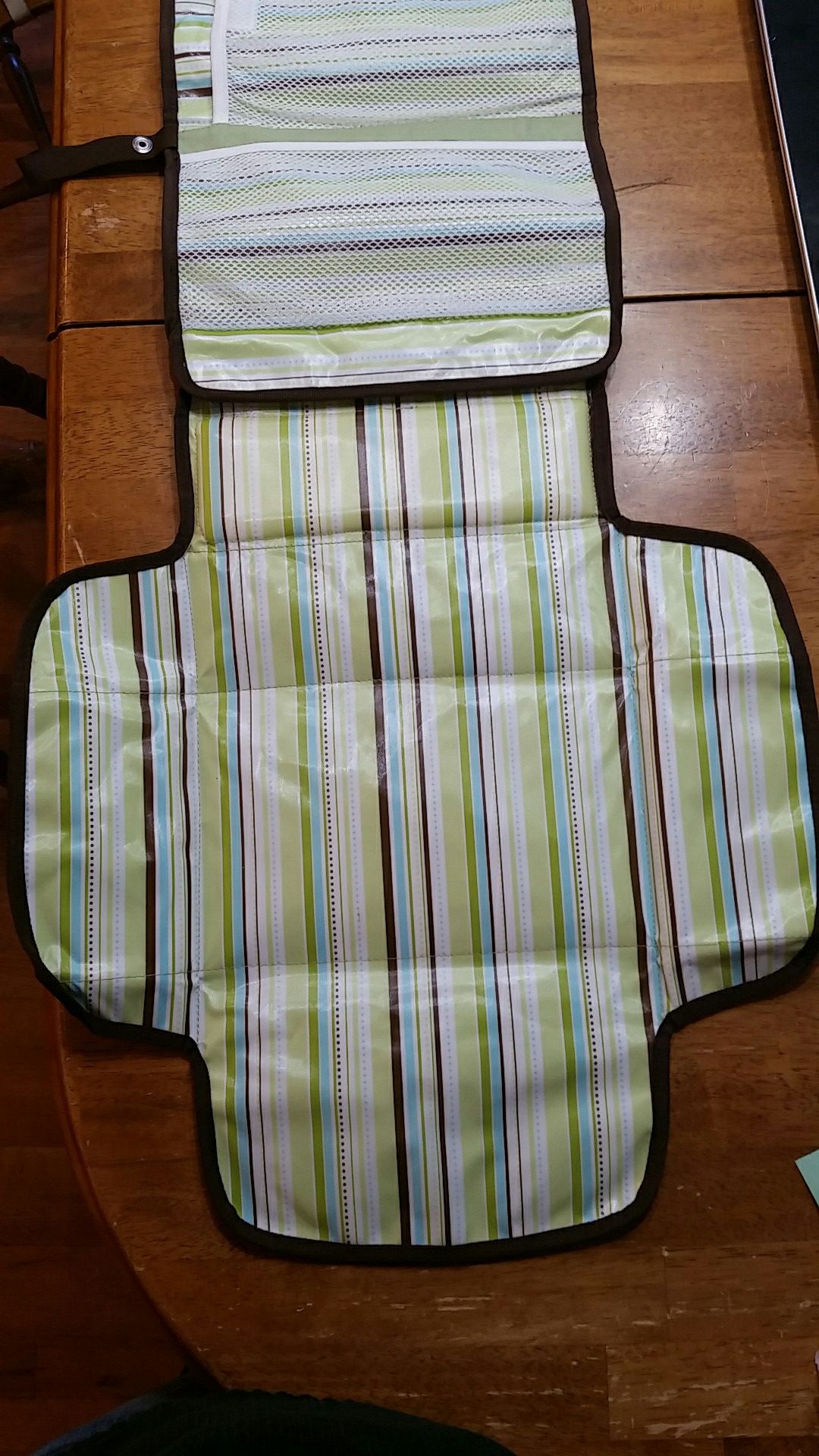 Designer bag includes a zippered outer pocket and 2 mesh inner pockets. Detachable changing pad using 2 velcro strips and a padded headrest. Also has a handy snap strap for your wrist or other conveniences.