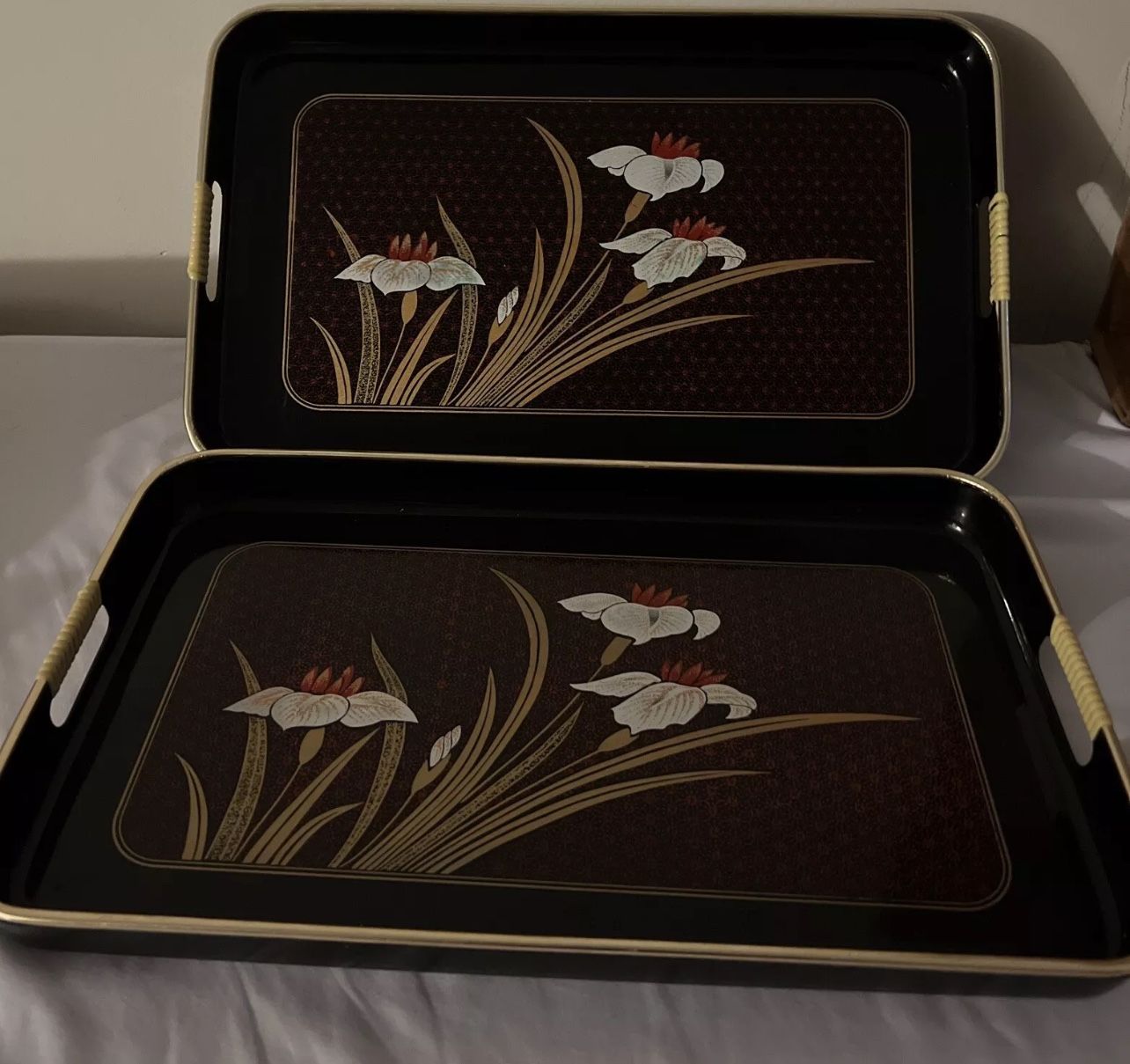 JAPANESE VTG SERVING TRAYS BLACK LACQUER FAUX BAMBOO HANDLES WHEAT FLOWERS. Such a great set of trays. Areas to look at. A tiny scratch on one tray see photo and corner wrap on other tray lifted a bit. Both areas do not take away from the greatness of these trays and worthy of purchase.
