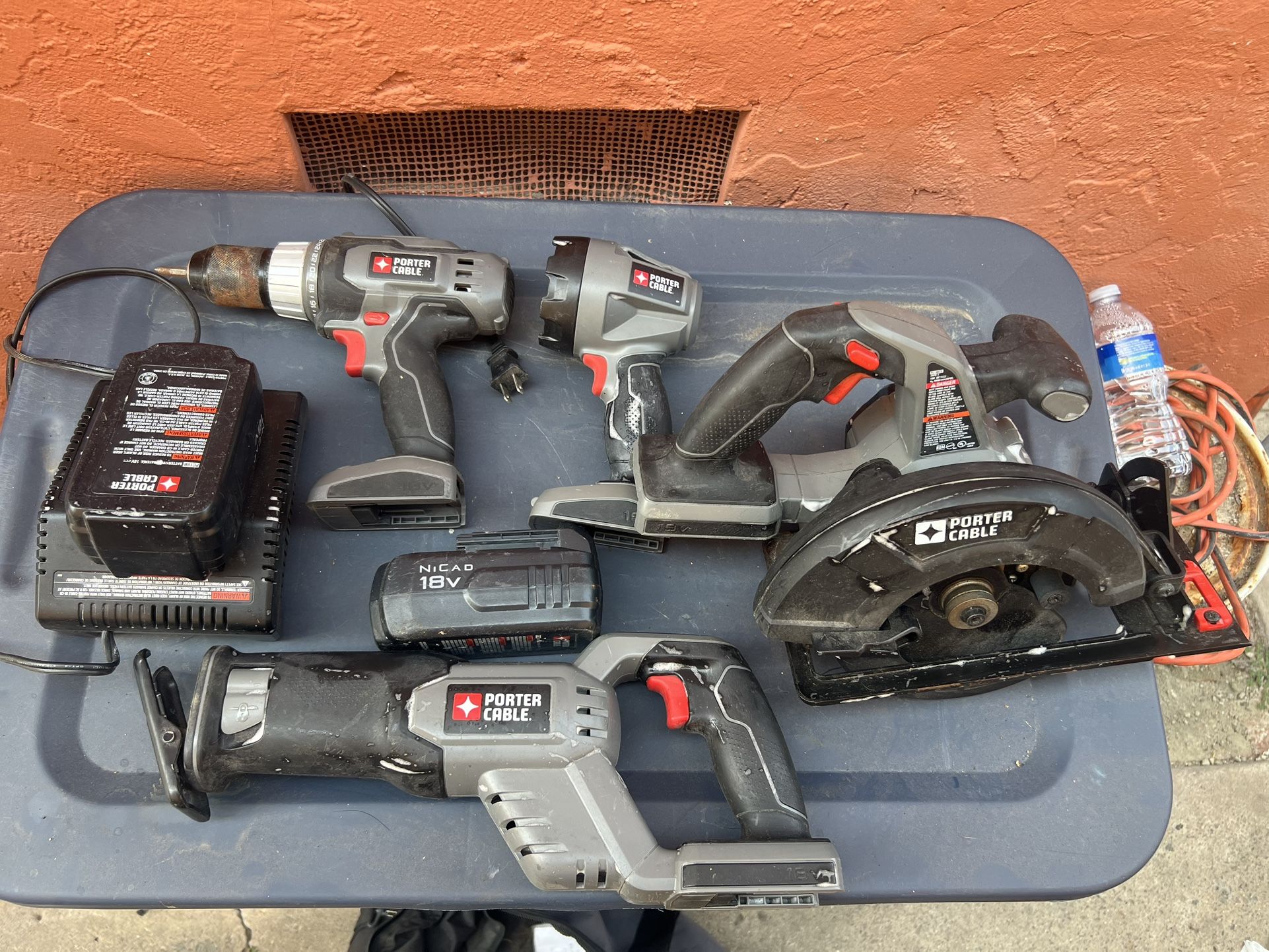 Includes Poorter cable drill, light, Skill saw, sawzall (reciprocating saw), Two18v battery, and a charger. in great shape used mostly used drills, but the saws are like new , blades are not included
