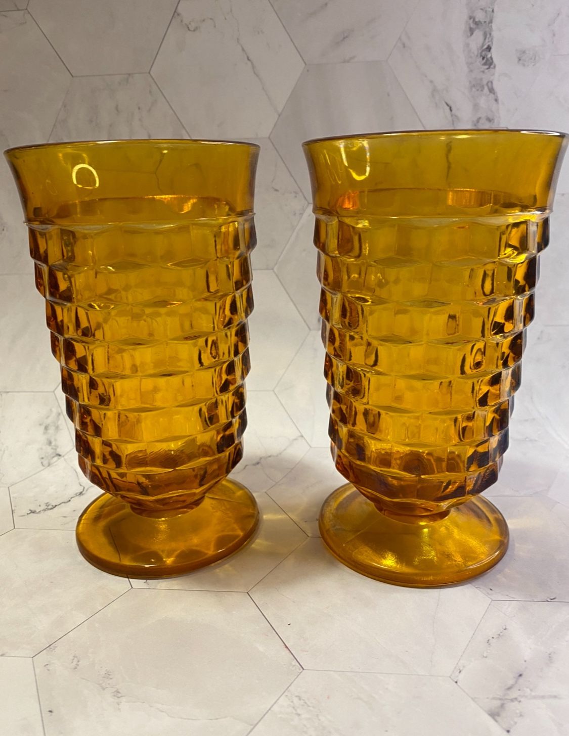 Set of (2) Vintage Indiana Glass Whitehall Colony Amber Gold Cubist Tumblers 6" tall.