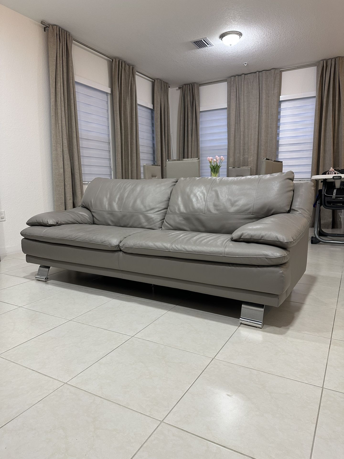 El Dorado Rio light gray genuine leather sofa (purchased 2021). Modern design with chrome legs, very comfortable and well maintained. In very good condition, no rips or tears. Smoke-free home. Selling due to redecorating. Originally $1,299.