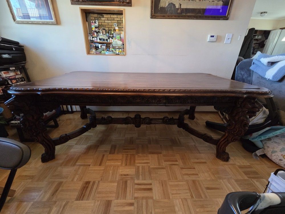 CARVED MAHOGANY BUREAU PLAT OR LARGE LIBRARY TABLE, the rectangular top overhanging a carved frieze with two aligned drawers along one side, raised on four highly carved lion monopod legs secured with stretchers. Dimensions: 31"H x 45.75"W x 84.75"L.