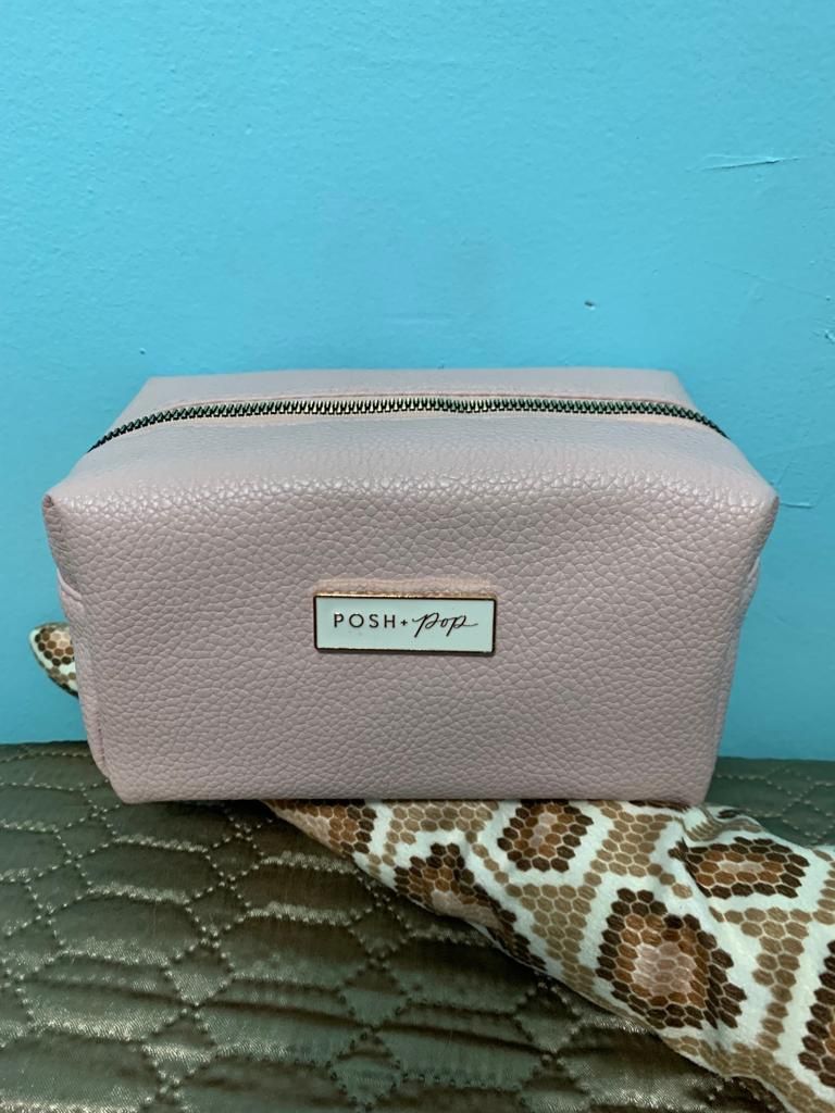 Pastel pink mini bag — good for carrying makeup. Se habla español