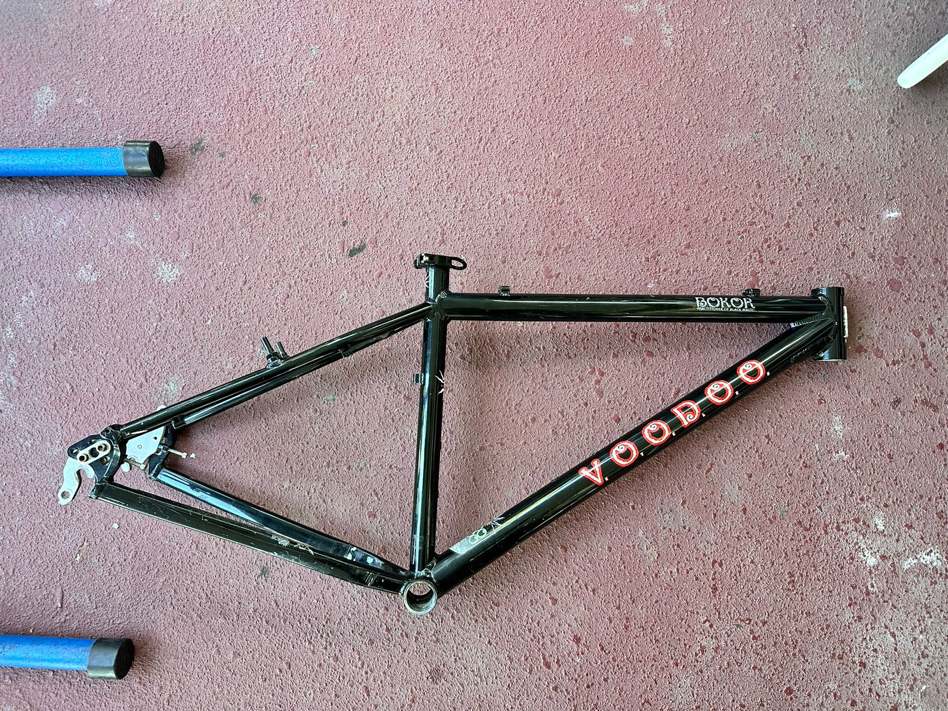 Voodoo Bokor “practitioner of black magic” Early 2000’s 7005 Aluminum Small size Size 15” bb to top tube Size 17” bb to top of seat tube Good for someone 5’5-5’7 Joe Murray Sliding drop outs Can fit really fat 26” or maybe 27.5” Can accept disc brakes or v brakes Makes a great hardtail Come with some scratches from normal wear and tear but nothing some black paint marker can’t fix* Come get this classic of a bike frame Mtb, hardtail, voodoo, vintage Mtb, vintage bike, 26” bike, Stumpjumper, trek, Cannondale, bike