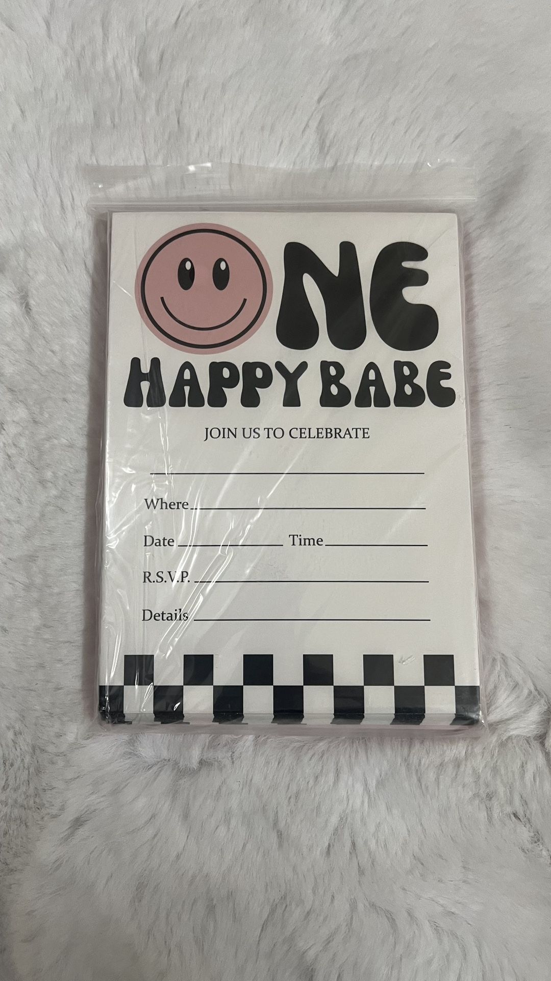 Add a fun, trendy retro vibe to your celebration with these adorable pink smiley face invitations! Featuring a large pastel pink happy face, bold "One Happy Babe" lettering in groovy font, and a classic black-and-white checkered border, these fill-in style cards are perfect for a girl's baby shower, first birthday party, or any preppy-themed event.Quantity: 25 invitation cards per pack Design: Cute retro smiley face theme in soft pink tones with "Join Us to Celebrate" and blank spaces for Where, Date, Time, R.S.V.P., and Details Includes: 25 matching pink envelopes + sheet of coordinating pink smiley face envelope seal stickers Size: Standard 5x7 inches (A7) – easy to mail or hand out Quality: Printed on sturdy cardstock, easy to write on with any pen New in sealed plastic packaging – ready to use! These are brand new, unopened packs – I have over 25 sets available, great for bulk buyers, resellers, or large events!