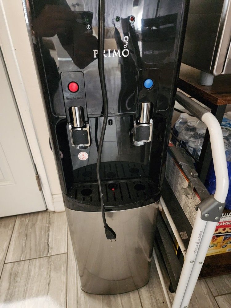 Bottom load primo water dispenser 2 temp cosmetic condition very clean hot works great only issue cold freezes up you have to turn off cold switch for ice to defrost then cold starts running again until it gets room temperatured turn cold back on so on and so fourth its a cheap fix primo said the parts is 15 on Amazon and apparently an easy fix we don't wanna mess with it selling for 35