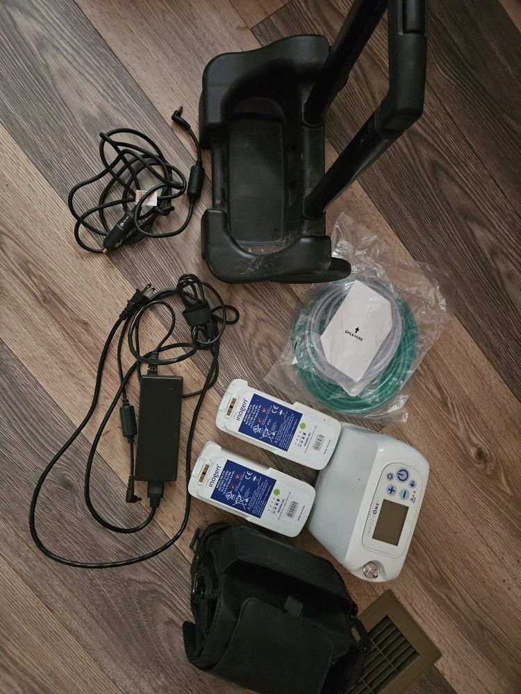 Portable air supply with many extras. Two batteries shoulder carry case plus a rolling carrier. AC charging cord and car charger new hose.