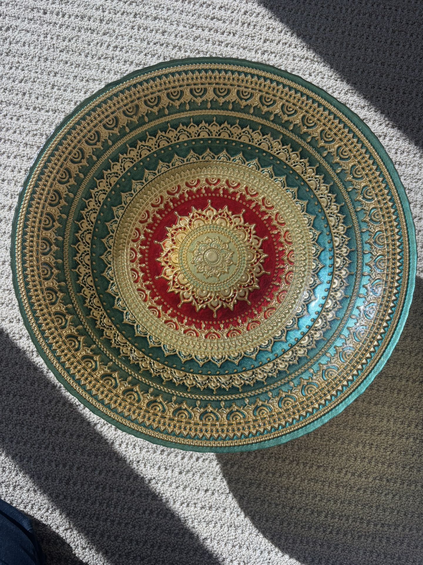 However you like to use it.. decorated platter or dish with Pedestal. Golden, red and green colors make it very exquisite .. elegant piece. $75 firm