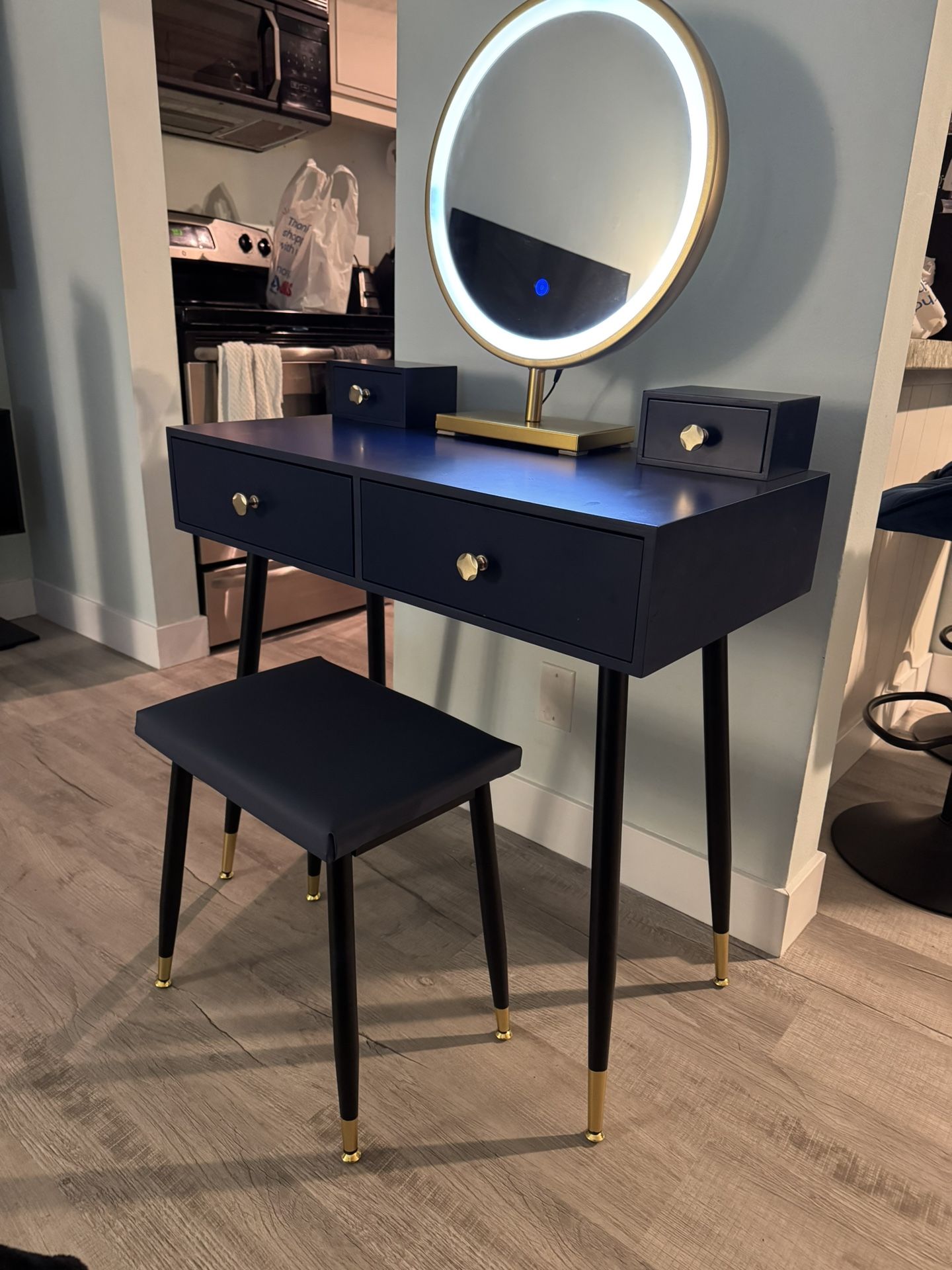 Get ready for your close-up with this luxe makeup vanity set, including a vanity table with a round rotating mirror and a cushioned stool. The adjustable mirror is a standout feature, with three different brightness settings, so you can adjust the brightness to your needs. This engineered wood vanity showcases a rich navy blue hue, and it rests on splayed legs with gold-finished feet for plenty of Hollywood appeal in your bedroom or dressing area. Two soft-close drawers and two small moveable drawers on the surface offer room for all of your beauty essentials. We also love that the matching stool has a padded faux leather seat that rounds out this set with an extra layer of panache. Adjustable brightness mirror: Just touch the vanity mirror to adjust 3 different brightness for your needs. Let your makeup be more delicate and elegant every time. Take the 12V power supply stick it directly on the mirror, mirror frame, or wall, and then plug and play. Vanity table set included: 1 vanity table with 2 big storage drawers and 2 small moveable drawers, 1 round rotating mirror, and 1 cushioned stool, It offers you enough space to store all your things. The drawers are removable.