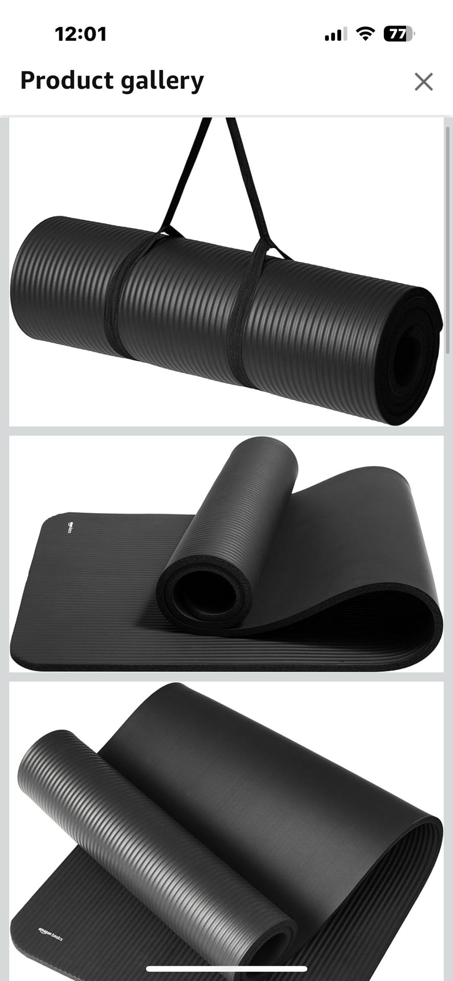 Amazon Basics 1/2 Inch Extra Thick Exercise Yoga Mat with Carrying Strap, Cushioned Support, for Fitness and Gym Workouts Never used Pick up only 100% NBR foam Imported Extra thick, cushy floor mat in Black for yoga, gym, and everyday exercise 1/2 inch thickness offers comfortable padded support and shock absorption; textured surface provides extra traction Durable foam construction offers stretchability and springs back into shape Elastic strap for secure rolled-up mat storage and easy over-the-shoulder carrying Wipes clean easily Product Dimensions: 74 x 24 x .5 inches (LxWxH)