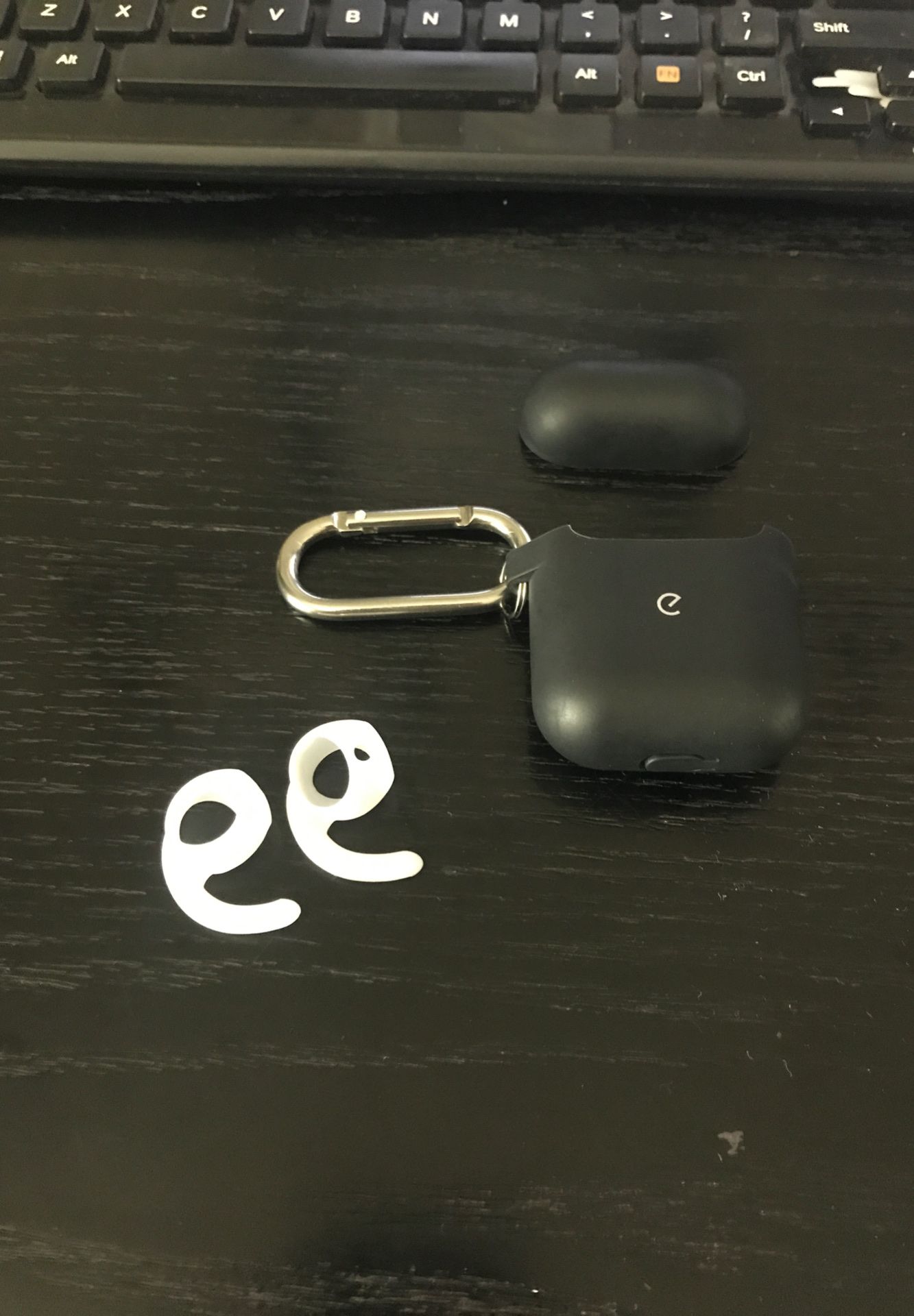 Selling apple air pod black silicone case, with carabiner clip as well as silicone ear clips to keep pods secure in your ear.